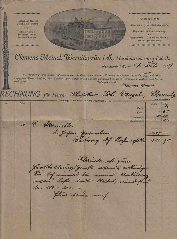 Solche Beilagen sind doch sehr berührend und aufschlußreich (ebenso manchmal Informationen von Verkäufern über die Familiengeschichte usw.). Dies hier lag bei einer alten Clemens Meinel- Klarinette (Vielen Dank, Enrico Weller für das Bild).