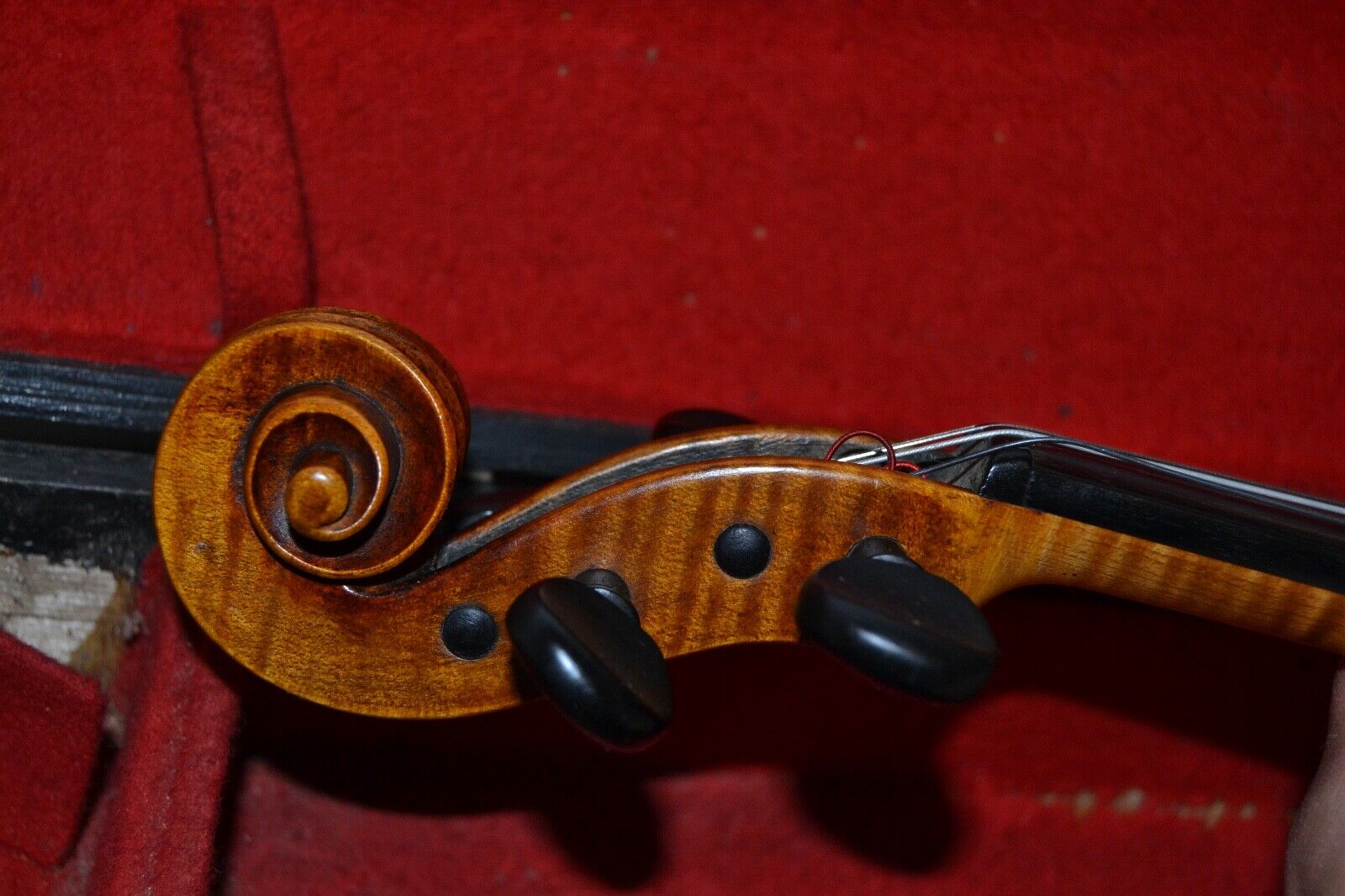 Für mich sieht es aus, als ob in der Decke und im Boden mit Sütterlin Handschrift K und darunter S geschrieben wurde. Lässt sich der Geigenbauer oder die Werkstatt damit finden? Das Instrument ist sehr sehr leicht, die Decke fühlt sich an, also ob Sie (chemisch?) behandelt worden wäre, Karton ähnlich. Der Klang hat schon fast etwas Cello-artiges.