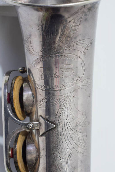 Die frühen B&S Saxophone (DDR-Produktion) mit dem blauen Emaille-Label sind ja bekannt, ich habe jedoch vor kurzem ein B&S Altsaxophon mit einem weiß emaillierten Logo erstanden. Das Schildchen ist außerdem nicht verschraubt sondern fest verlötet und das Saxophon hat keine Seriennummer. Die Gravur ist auch anders und größer als normalerweise und es ist eingraviert "MADE IN GERMANY" statt "GDR". Außerdem ist keine Hoch Fis-Klappe vorhanden.