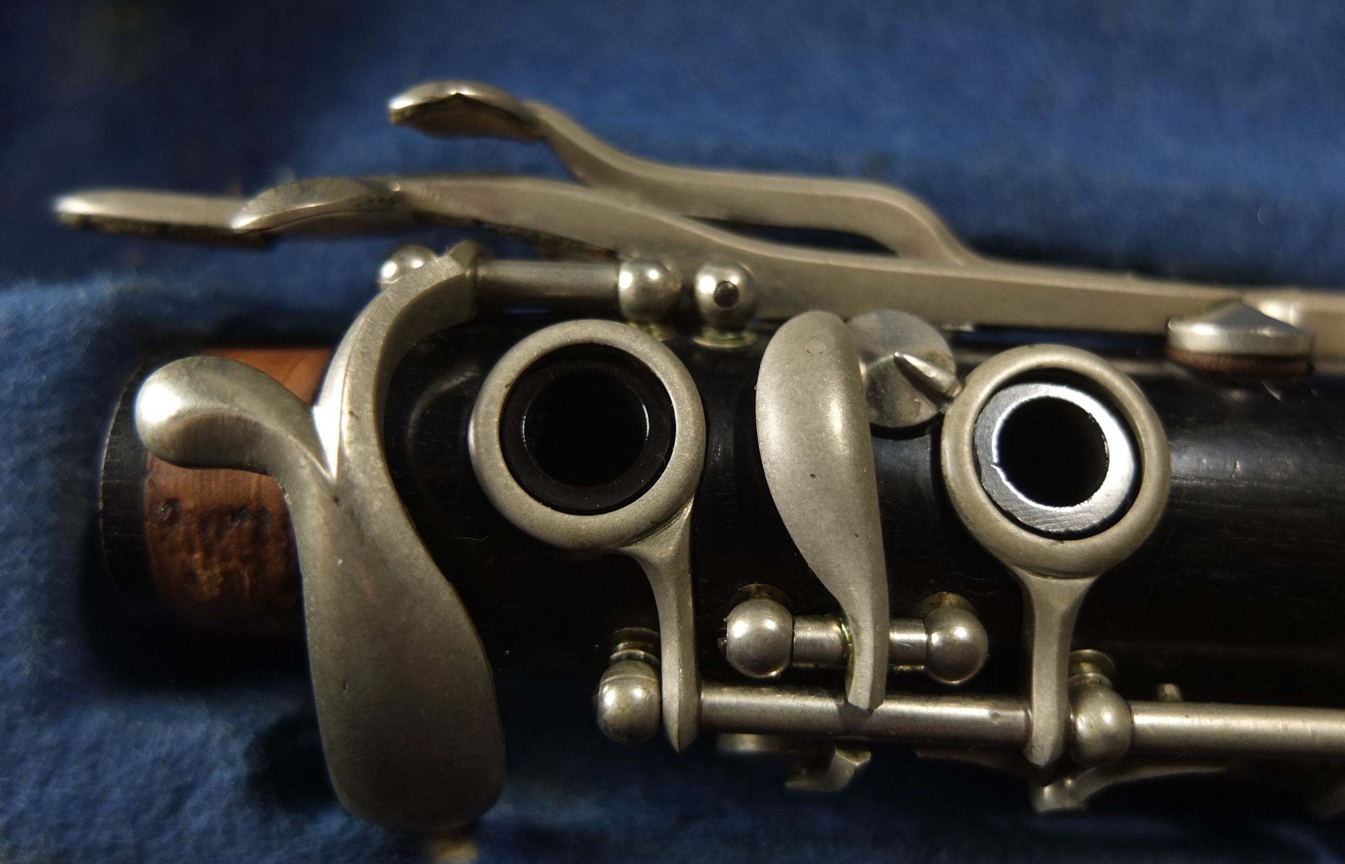 Die Klarinette hat nur 3 Trillerklappen und diese sehen relativ altmodisch aus. Es gibt keine Gabel-F-Verbesserung am Unterstück. Die As/Gis-Klappe am Oberstück sieht ebenfalls altmodischer aus als sonst (verglichen habe ich mit Instrumenten mit Seriennummern 10xxx und 13xxx). Die Klarinette hat die weiße Bakelit Duodezimhülse. Was können wir daraus schließen?