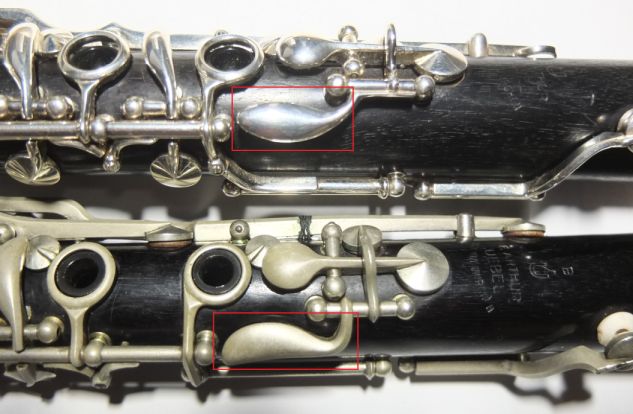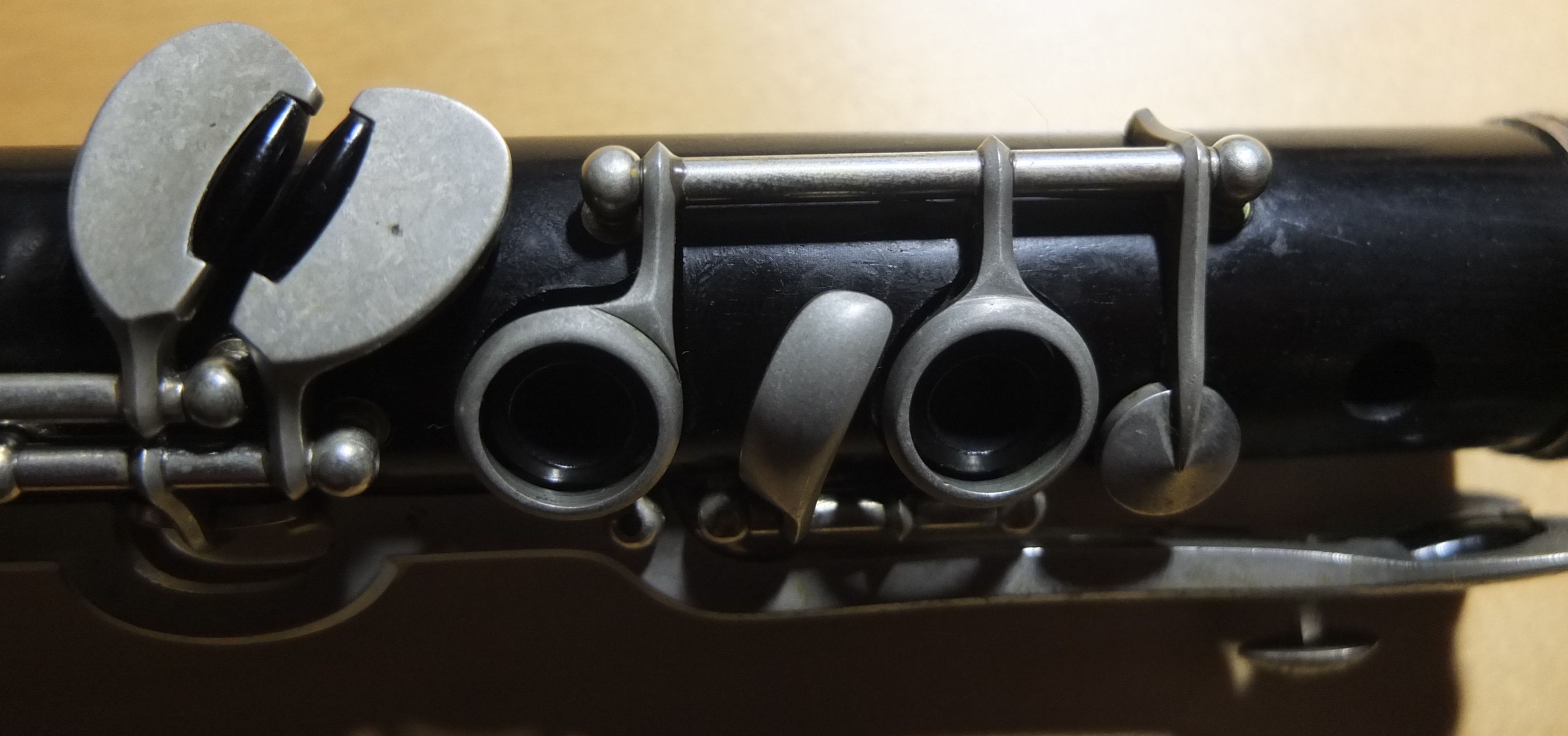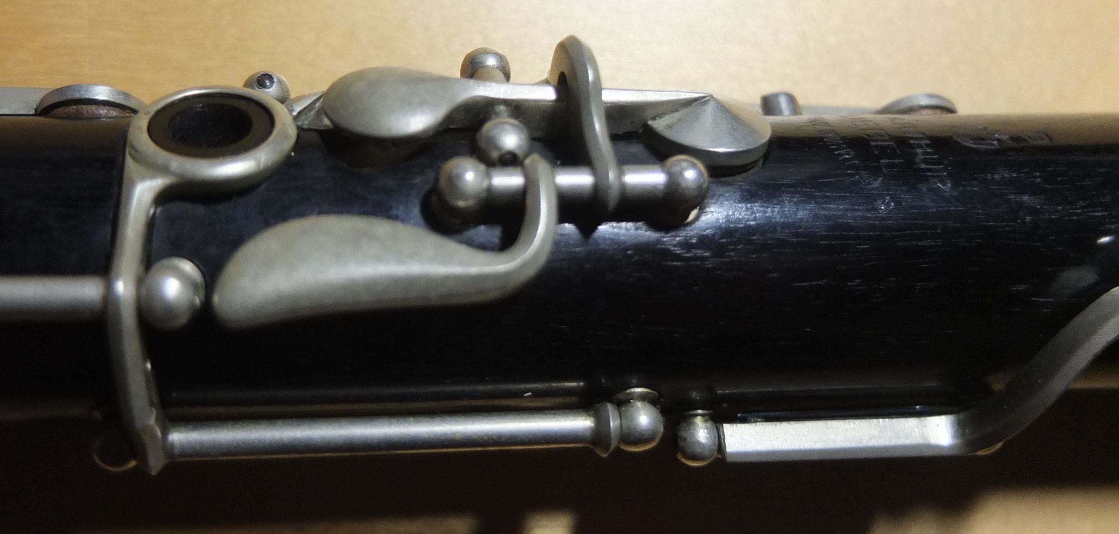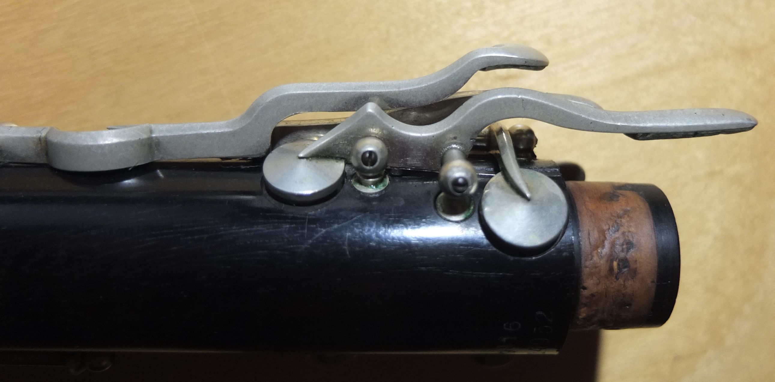 Üblich bei Uebel waren eigentlich flache Trillerklappen mit den spitzen Erhebungen an den Lagern. Die As/Gis-Klappe am Oberstück hat außerdem eine ungewöhnlich unsymmetrische Form. Daher würden mich Fotos von ähnlichen Uebel-Instrumenten aus dieser Zeit interessieren (oder eine Erklärung, warum ein Instrument doch mal aus der Reihe tanzt).