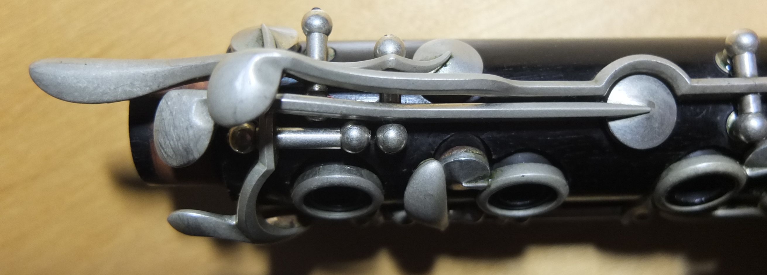 Mich würde jetzt noch interessieren, ob es andere Uebel-Klarinetten aus der Zeit (Mitte der 1950er Jahre) gibt, die ähnliche Trillerklappen haben (sowie eine As/Gis-Klappe von dieser Form). Die längste Trillerklappe ist übrigens nicht gebrochen, sondern es wurde nur versucht, mit einem Faden die Feder zu fixieren.