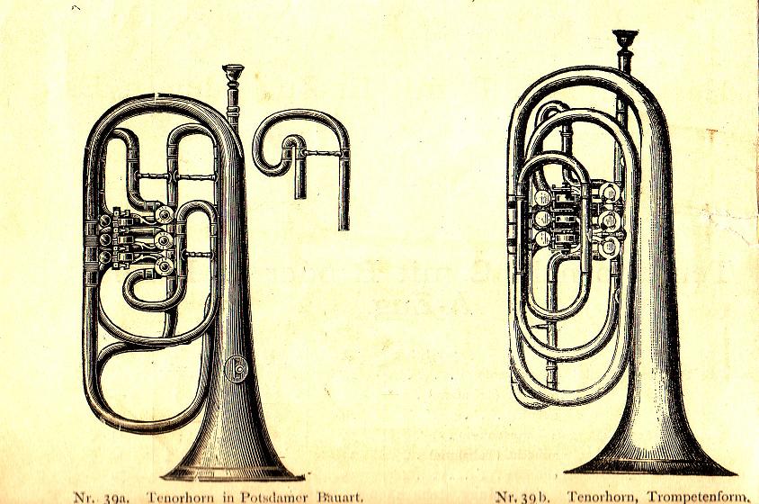 Da ich zufällig gerade einen alten Aug.-Clemens-Glier-Katalog auf dem Scanner liegen habe, konnte ich dort gleich einmal nachsehen. Ca. 1900 bietet die Firma das Tenorhorn in drei Varianten an: Trompetenform, aufrecht (in Tubaform) und eiförmig. Es gab die Instrumente in C mit B-Zug und in B mit A-Zug.