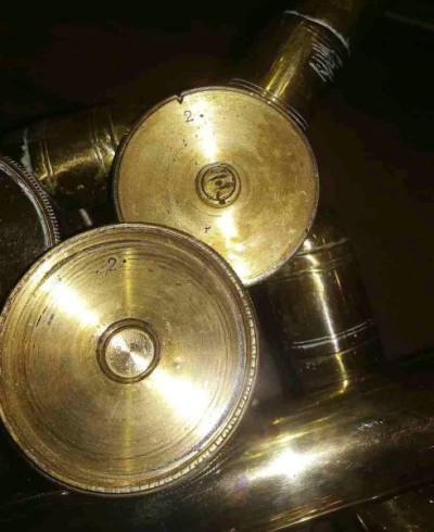 An der Mundrohroberzwinge habe ich lediglich eine Art Handwerkerzeichen entdecken können. Im beigefügten Foto sieht es eher aus wie ein zufälliger Kratzer. Im Original scheint es sich aber eher um eine Gravur zu handeln. Das Mundrohr selbst hat übrigens einen Innendurchmesser von 16mm was das Austesten eines passenden Mundstücks nicht gerade vereinfacht hat.
