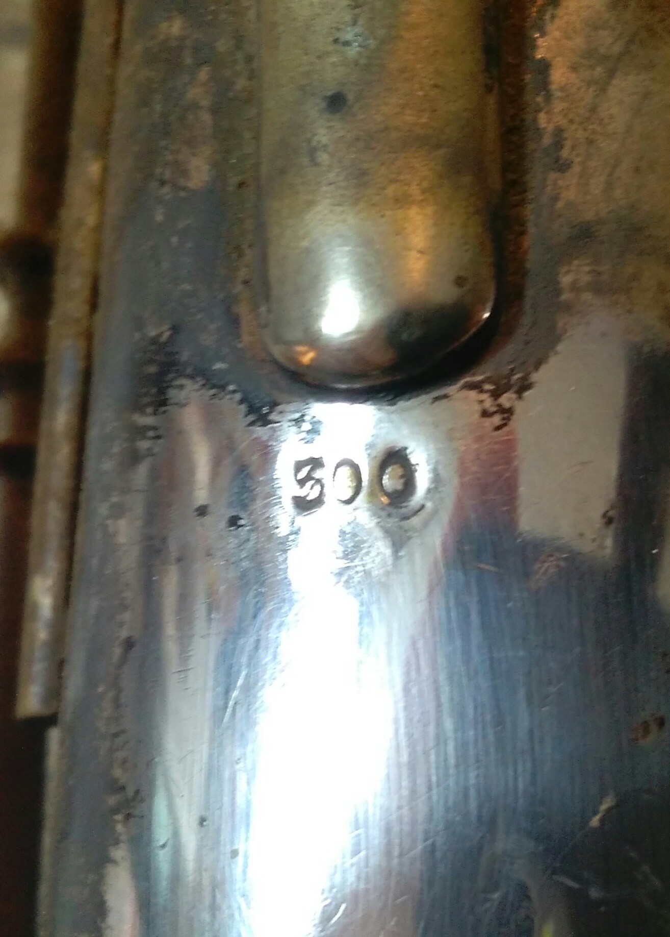 eindeutig vor 45 gebaut, trägt die nummer 500 unter dem daumenhalter, versilbert wie ein italiener: glänzend (billig in der optik) mit stimmhalter/schraube am s-bogen.