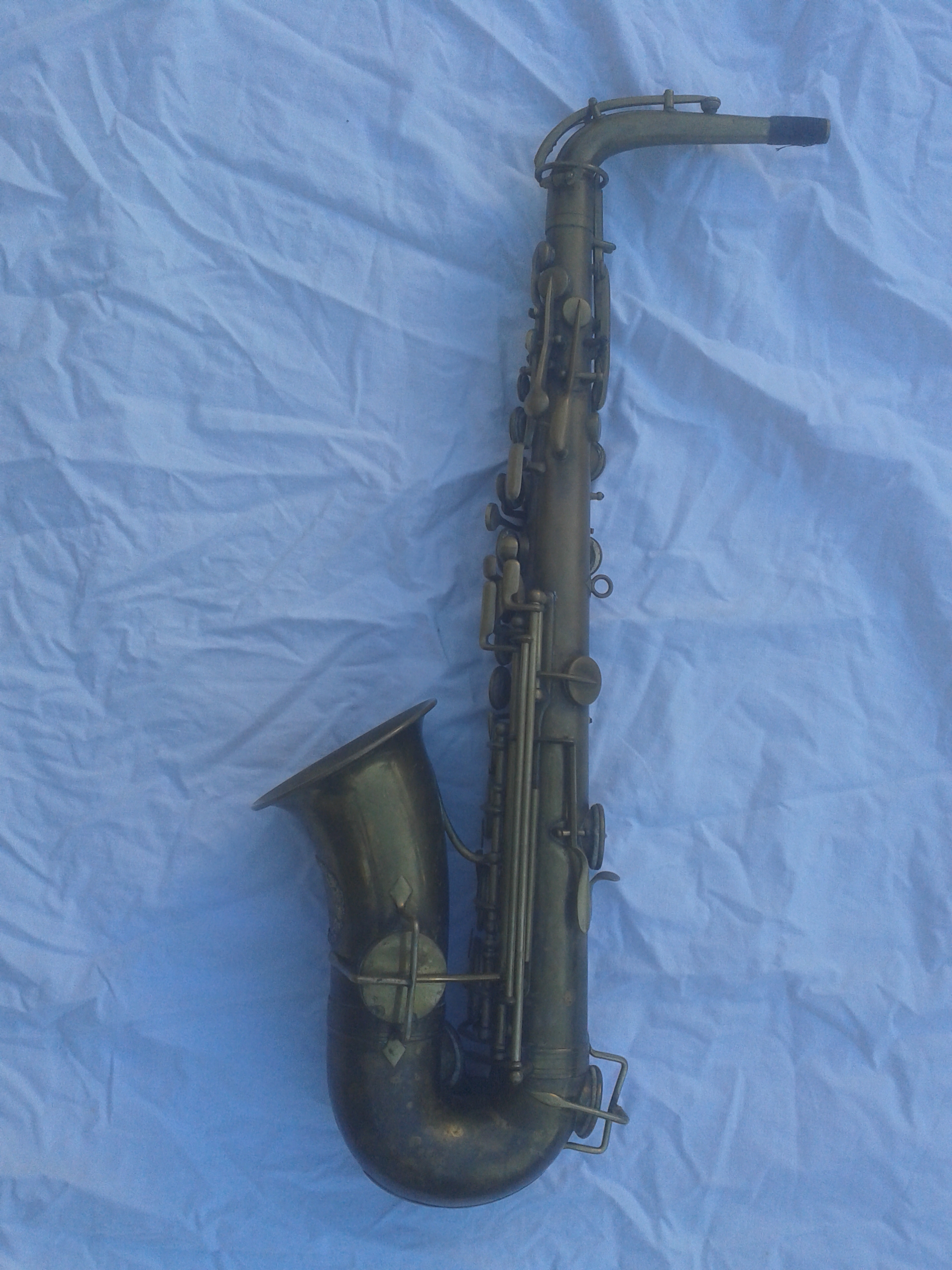 Nun zu meinem gesichteten Instrument. Es handelt sich um ein Alt Saxophon, wohl noch aus dem 19. Jahrhundert, welches ich als eine abgespeckte Version dieser Herfort Modelle sehe, da vom selben Hersteller, aber nicht mehr mit Gaubert gezeichnet. Lediglich Laignel, aber auch mit dem aufgelötetem Lorberkranz. Auch bei diesem Instrument ist die linke Kleinfingermechanik mit dem tiefen C verbunden, ferner weitere Verbindungen der rechten mit der linken Hand. Ich sehe das Instrument als Prototyp, da verschieden Veänderungen in der Fertigung sichtbar sind. Genaueres später einmal. Eventuell werde ich das Instrument in der Zukunft für den Eigentümer restaurieren, dann werde ich mehr erfahren.