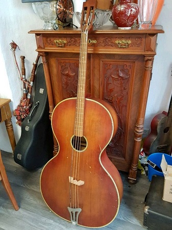 könnte kürzlich diese schöne Kontrabass-Gitarre erwerben. Die Mensur beträgt 111 cm, Gesamtlänge 162 cm. Korpus: 97 cm x 66 cm x 17 cm. Hersteller siehe Foto. Der Vorbesitzer hat sie in Berlin erworben und sie war wohl eine Spezialanfertigung auf Bestellung für irgendeine Tanzkapelle.