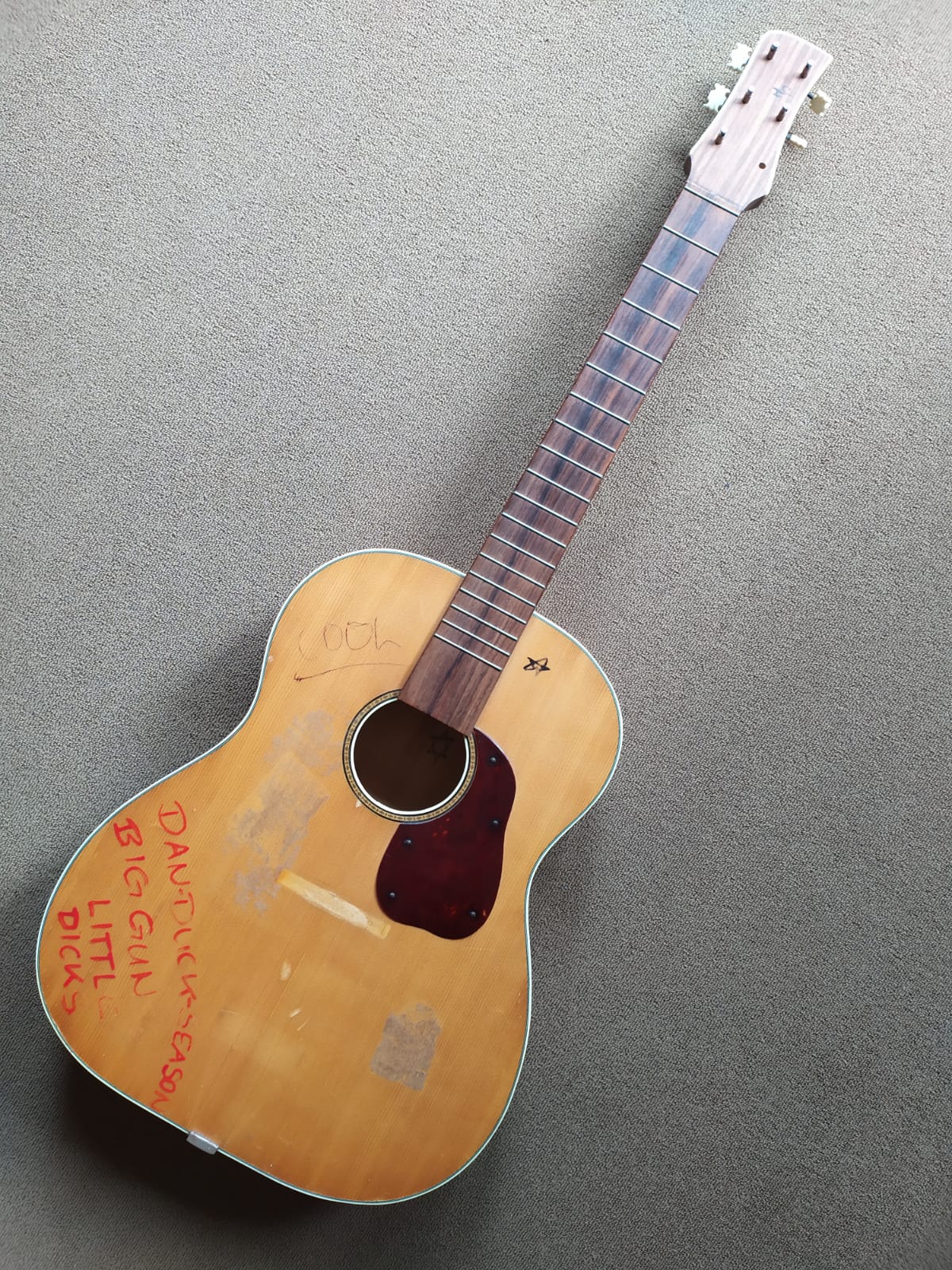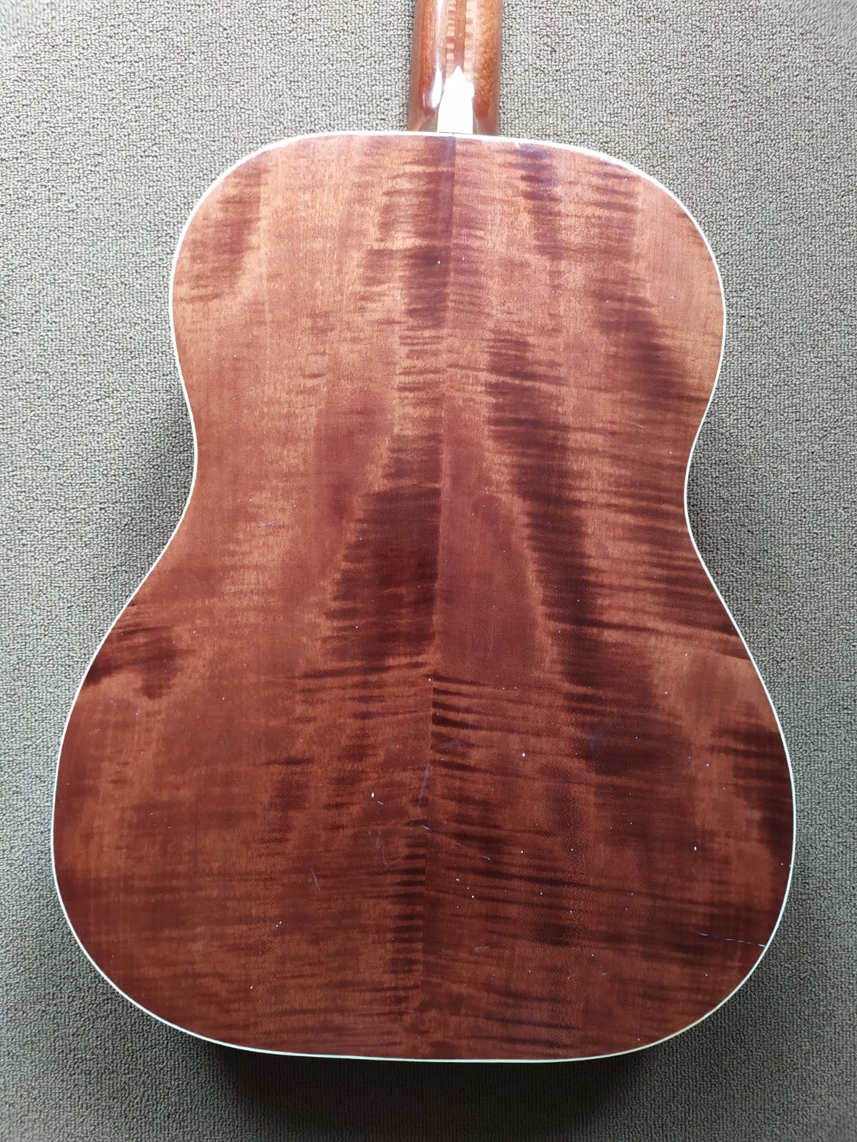 Hallo, diese Gitarre wurde vor dem Müllcontainer gerettet. Die Mechaniken und die ganze Bauweise lassen darauf schließen, dass diese Gitarre aus der DDR ist. Kurioserweise hat sie einen Westerngitarrenkorpus, aber einen so breiten Hals wie bei einer Konzertgitarre (52mm am Obersattel), auch ohne Griffbrettradius aber mit Nullbund. Mensur ist 640mm. Die Decke ist laminiert (Spiegelprobe, Inneseite Korpus sind die Jahresringe viel breiter). Beim Boden und Zargen bin ich mir nicht sicher, Die Flammung vom Ahorn passt von der Intensität und Richtung zur Außenseite, wobei ich aber nicht glaube, dass das massive Hölzer sind.