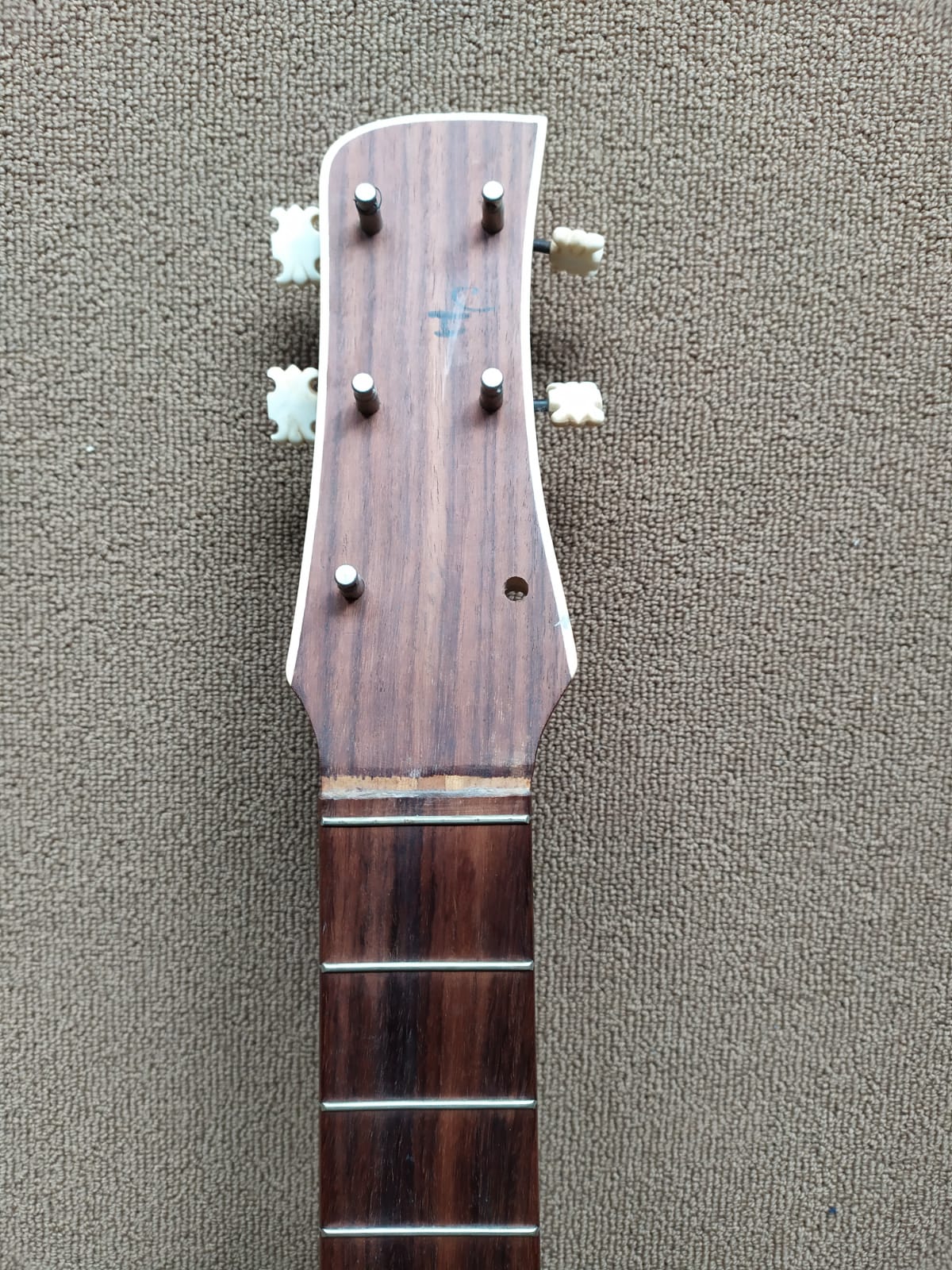 Ach übrigens sieht die Gitarre jetzt viel schöner aus, ich habe sie optisch überarbeitet, sie hat neue Mechaniken, Steg, Sattel und Saitenhalter bekommen, ich habe die Bünde abgerichtet und nun kann man sie wieder bespielen.