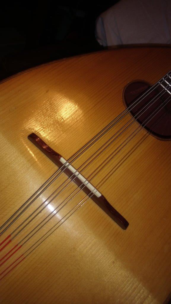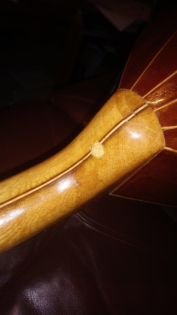 Guten Tag, mir ist ein Mandoloncello zugeflogen, dessen Herkunft der ("westdeutsche") Vorbesitzer nicht wusste und das ich auch nicht verorten konnte. Vielleicht ist es ein vogtländisches Instrument. Es ist grundsätzlich gut und sauber gebaut; auffallend sind der sichtbar gedübelte (oder zumindest das mit einem Dübel verschlossene Schraubenloch vom) Hals und der wellige Korpus, der eigentlich eher den Eindruck macht, als ob er überfurniert wäre. Auch der Saitenhalter weist ein kleines Detail auf (einen "Haken" an der unteren Schraube), das mir sonst noch nie aufgefallen ist.