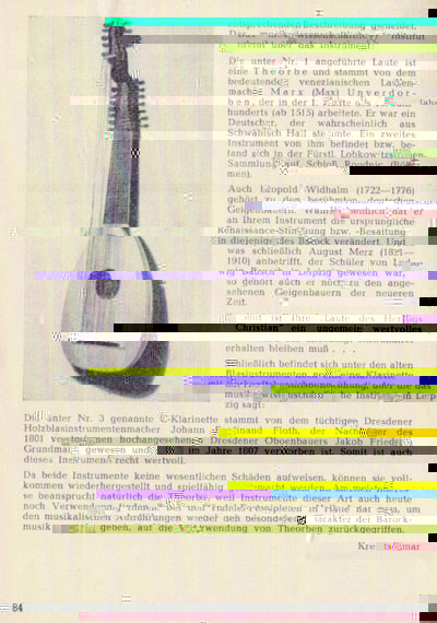 Im Rahmen eines Projektes zu Lauten von Leopold Widhalm bin ich auf eine Laute im Heimatmuseum in Eisenberg gestoßen. Diese Laute war ursprünglich im 16. Jh. von Marx Unverdorben als 7- oder 8-chörige Laute mit Knickhals gebaut worden. 1768 wurde dieses Instrument dann von Leopold Widhalm in Nürnberg zur 13-chörigen Barocklaute mit Schwanenhalslaute umgebaut. Einen weiteren Umbau musste das Instrument im Jahre 1909 durch August Merz in Augsburg über sich ergehen lassen. Dabei wurde sie möglicherweise zu einer theorbierten Gitarrenlaute gemacht. In dieser Form ist sie in einem Foto in der Monatszeitschrift für Kultur und Heimat, Jg. 1 August 1956 abgebildet.