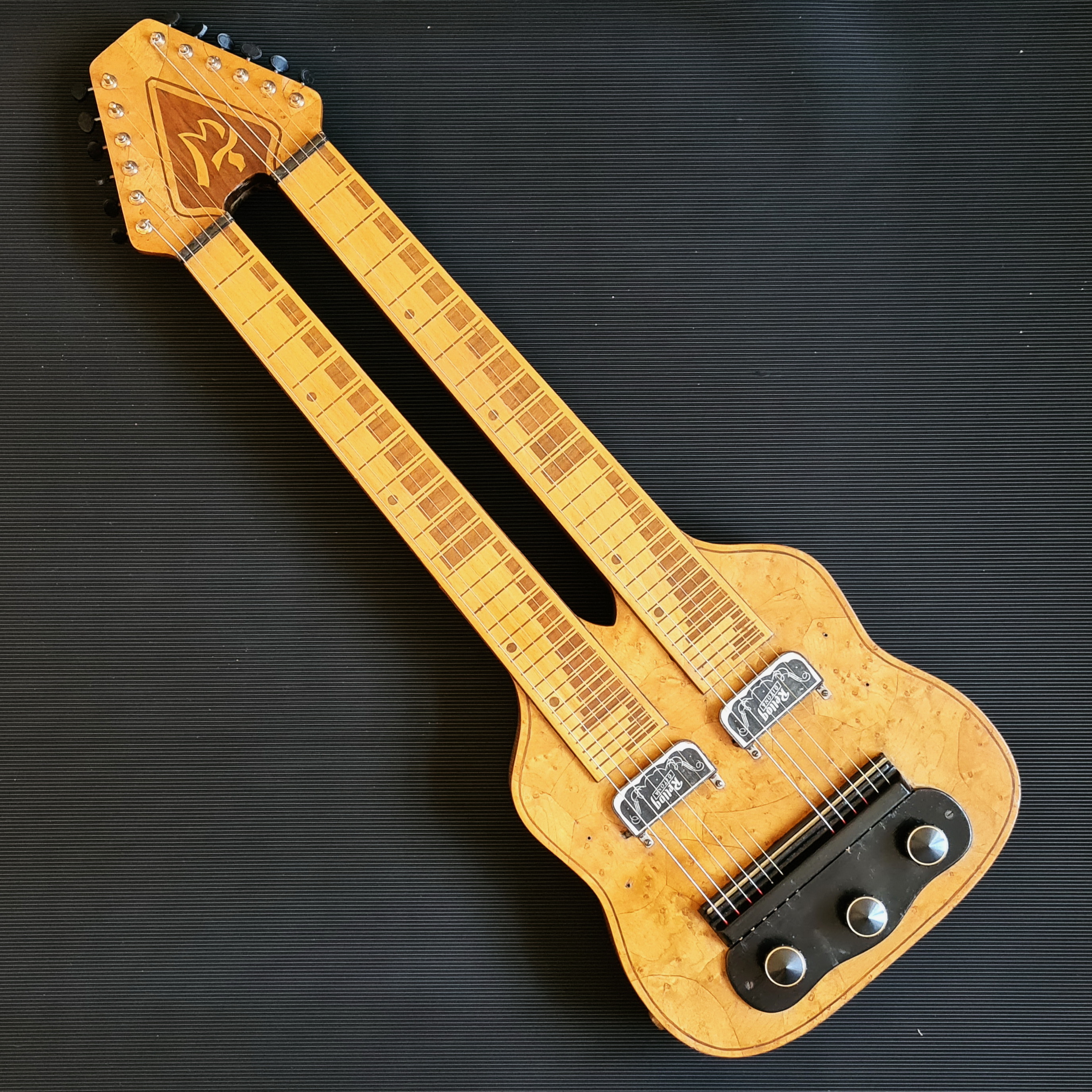 kürzlich habe ich eine Hawaiigitarre erworben, über die ich gerne mehr in Erfahrung bringen würde. Sie ist sehr aufwändig gearbeitet, massiv, nicht hohl, mit Furnier aus Wurzelholz oder Vogelaugenahorn (ich kenne mich da nicht gut aus), mit Ornamenten als Intarsien und einem anscheinend handgeschnitzten Übergang von den Hälsen zur Kopfplatte (Rückseite). Auf der Kopfplatte ist das Monogramm MT eingelegt.
