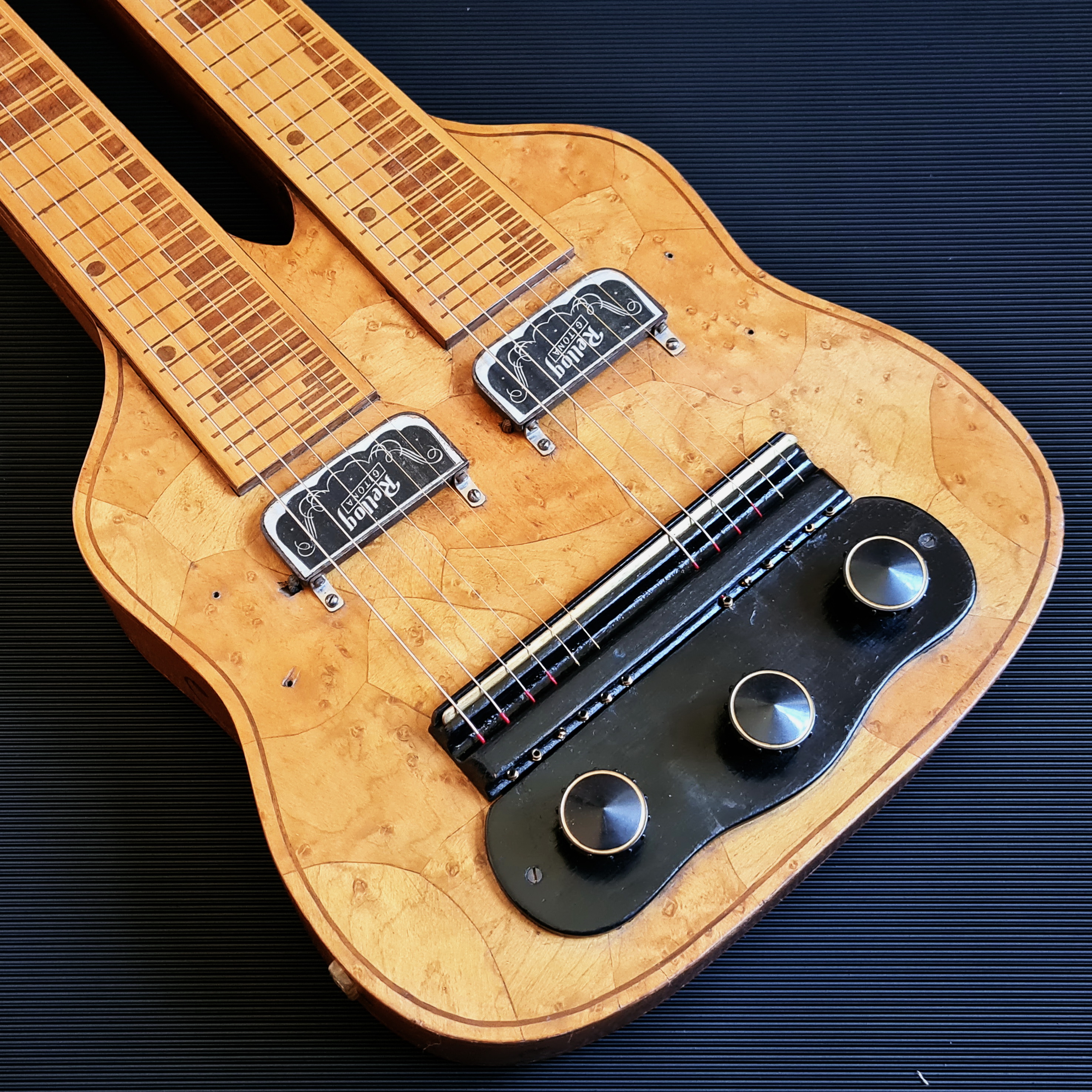 Ich wüsste gerne, wer diese Gitarre gebaut hat. Den Bauteilen nach kommt sie vermutlich aus dem Vogtland, die Rellog-Pickups und die Mechaniken von WARG aus Klingenthal mit den genoppten Tunerknöpfen (ursprünglich waren sie weiß) wahrscheinlich von einer Mandriola entlehnt. Die Form der Kopfplatte ist für meinen Geschmack etwas unproportioniert, hier hat der Erbauer offensichtlich Wert darauf gelegt, dass die Saiten möglichst in gerader Linie zu den Mechaniken laufen; dies zusammen mit dem engeren Wellenabstand der kleinen Mechaniken ergibt diese gedrungene Form. Griffbrett und Saitenhalter erinnern an Otwin Hawaiigitarren, die Potiknöpfe wiederum können von einem Röhrenradio stammen.
