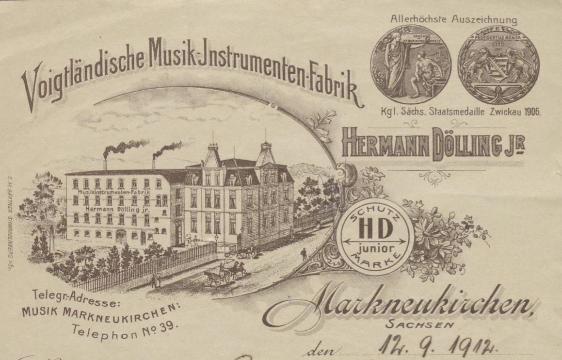 Actually the buldings still exist in Krumme Strasse 10 in Markneukirchen but the instrument business was closed already around 1923 when Hermann Dölling Jr. died. Afterwards starting 1923 a Walter Dölling (maybe his son?) had a business of producing gut strings for instuments there and during East German (DDR) times they produced suture material for surgery. The Walter Dölling & Co. KG, special factory for surgical sutures was expropriated in 1972 and converted into the VEB ASEPTUR surgical sutures. (VEB = state-owned enterprise).