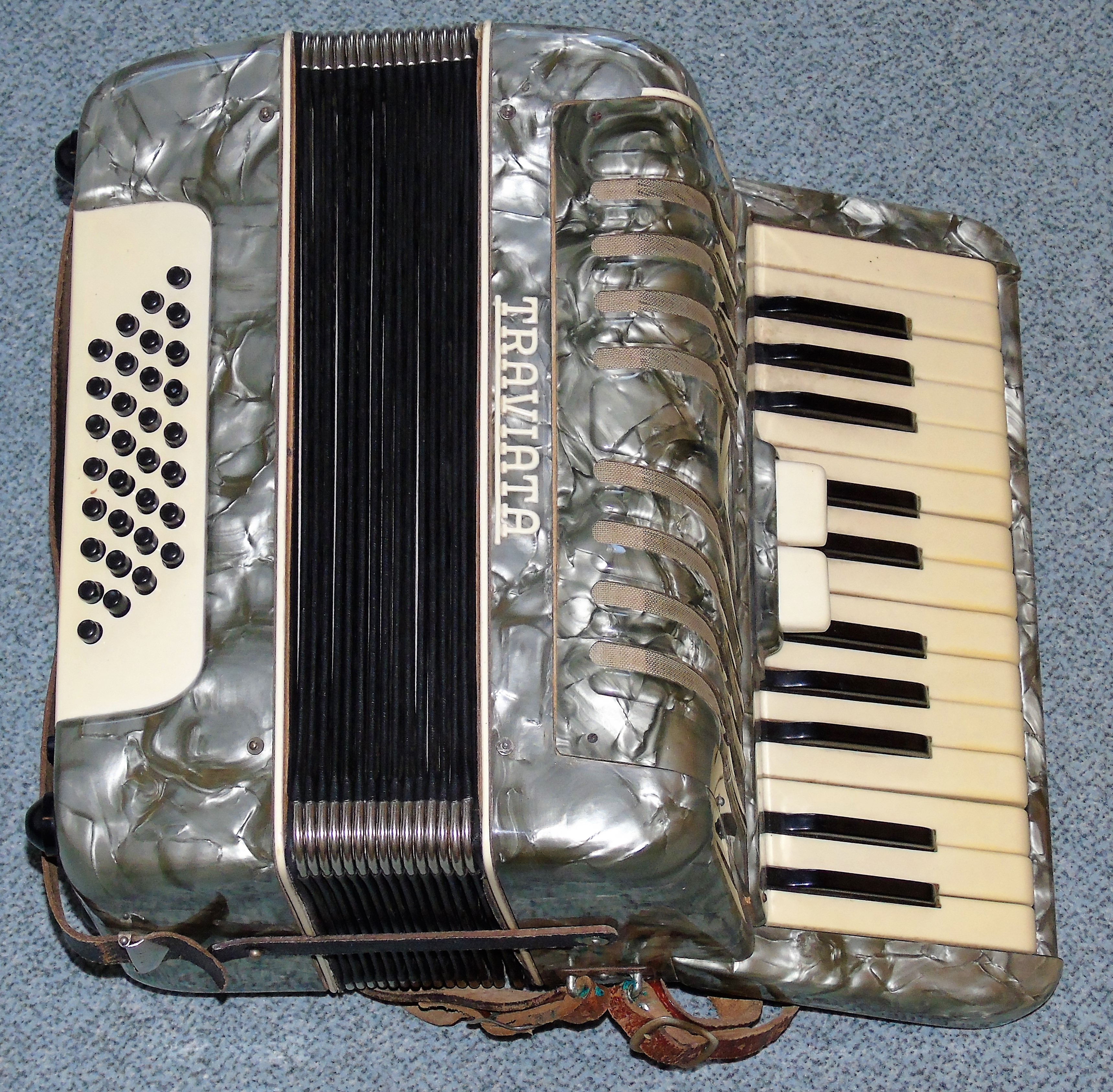 1997 habe ich bei einem Magdeburger Trödler ein Traviata-Akkordeon erstanden (s. Foto). Die Spieleigenschaften sind zufriedenstellend, Beschädigungen oder Mängel hat es nicht, jedenfalls keine sichtbaren. Ich habe bisher nur ein ähnliches Instrument im Internet entdeckt, ohne Register und nur mit 12 Bässen. Ich tippe auf Klingenthal als Herstellungsort.