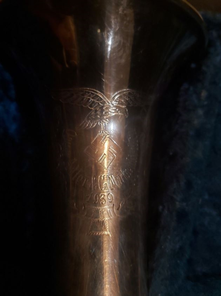 Der Becher hat als Gravur den Reichsadler und das H-Kreuz.
