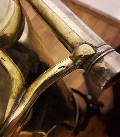 Ihre Anfrage und Ihre Tuba sind durchaus ein Puzzleteil in der innerdeutschen Instrumentengeschichte. Daher freut mich auch Ihre Teilnahme und eigene Recherche dazu. Bezüglich des "Zeichens" muss ich Ihnen aber erneut widersprechen. Was dort im geraden Teil der Mundrohr-(Schmiede)stütze zu sehen ist, ist wirklich - und nun auf Ihrem neuesten Foto sieht man es besser - kein absichtlich eingebrachtes Signum eines Handwerkers. Vielmehr ist es ein Materialfehler, wie er einst allerding nur bei Gussteilen vorkam. D.h. beim Gießen treten ungewollt Luft- oder auch Schmutzeinschlüsse auf, welche erst bei der späteren Bearbeitung zu Tage kommen. Und genau so sieht das dann aus.