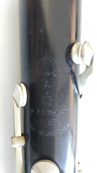 Bei der A-Klarinette handelt es sich mit hoher Wahrscheinlichkeit um eine aus der Werkstatt von F. Arthur Uebel. Der auf dem Bild erkennbare Firmenstempel ist zweigeteilt, unten der der Firma Uebel, oben der der schweizer Importfirma „HUG & CO.“. Die Klarinette wurde also von Uebel hergestellt und dann in der Schweiz von HUG verkauft.