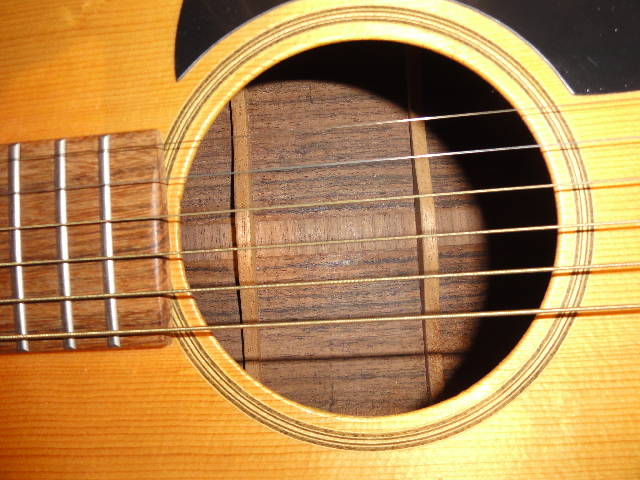 Die Decke ist auf jeden Fall massiv, was man am Schallloch sehen kann. Innen ist am Hals eine Inbusschraube zum Verstellen der Halskrümmung.