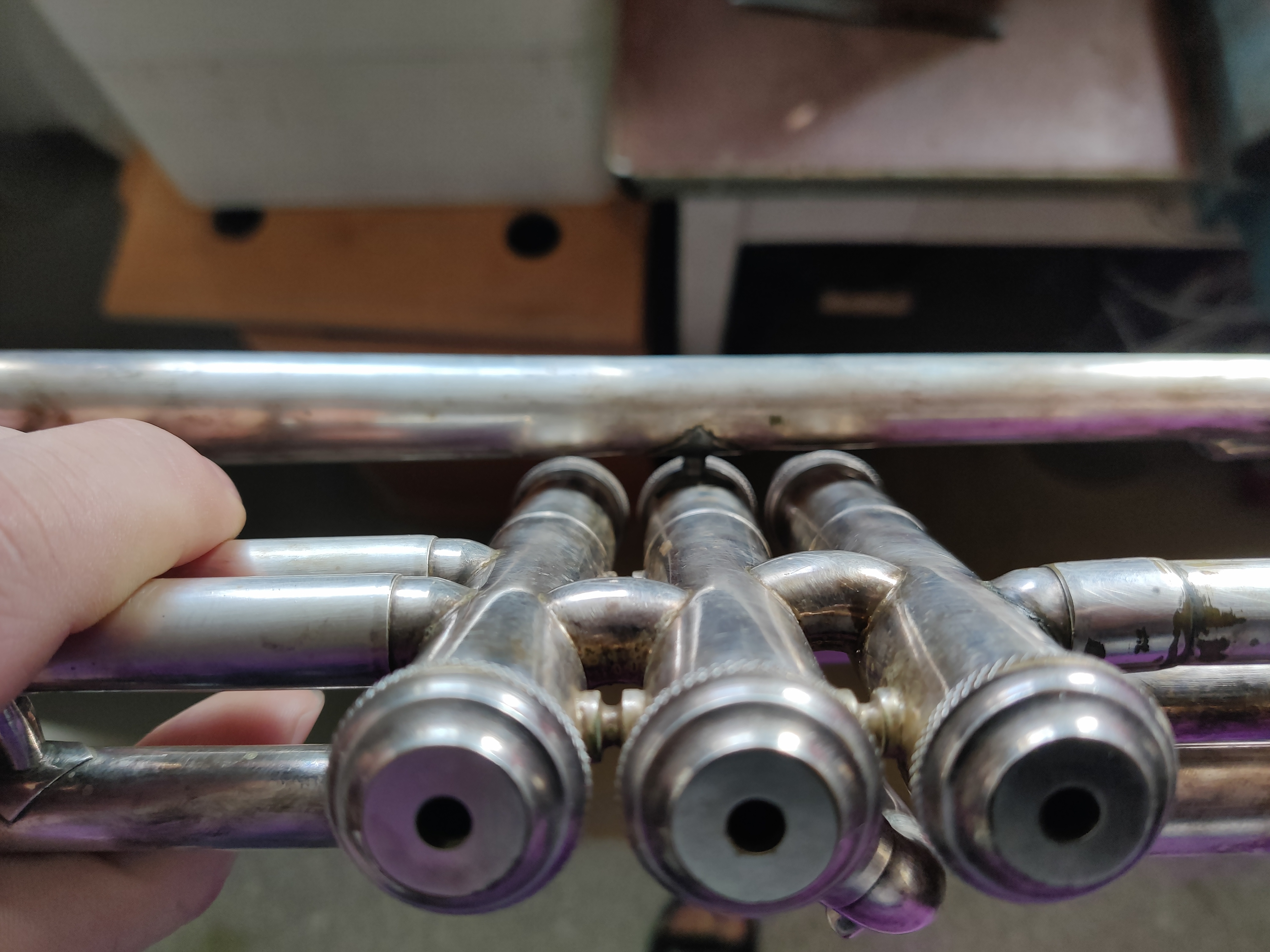 genau das ist die Stelle, an welcher die gesuchte Seriennummer zu finden gewesen wäre. Da sich dort keine befindet, ist Ihre Trompete auch nicht auf ein genaues Herstellungsjahr zu datieren oder gar eine Modellbezeichnung herauszufinden.