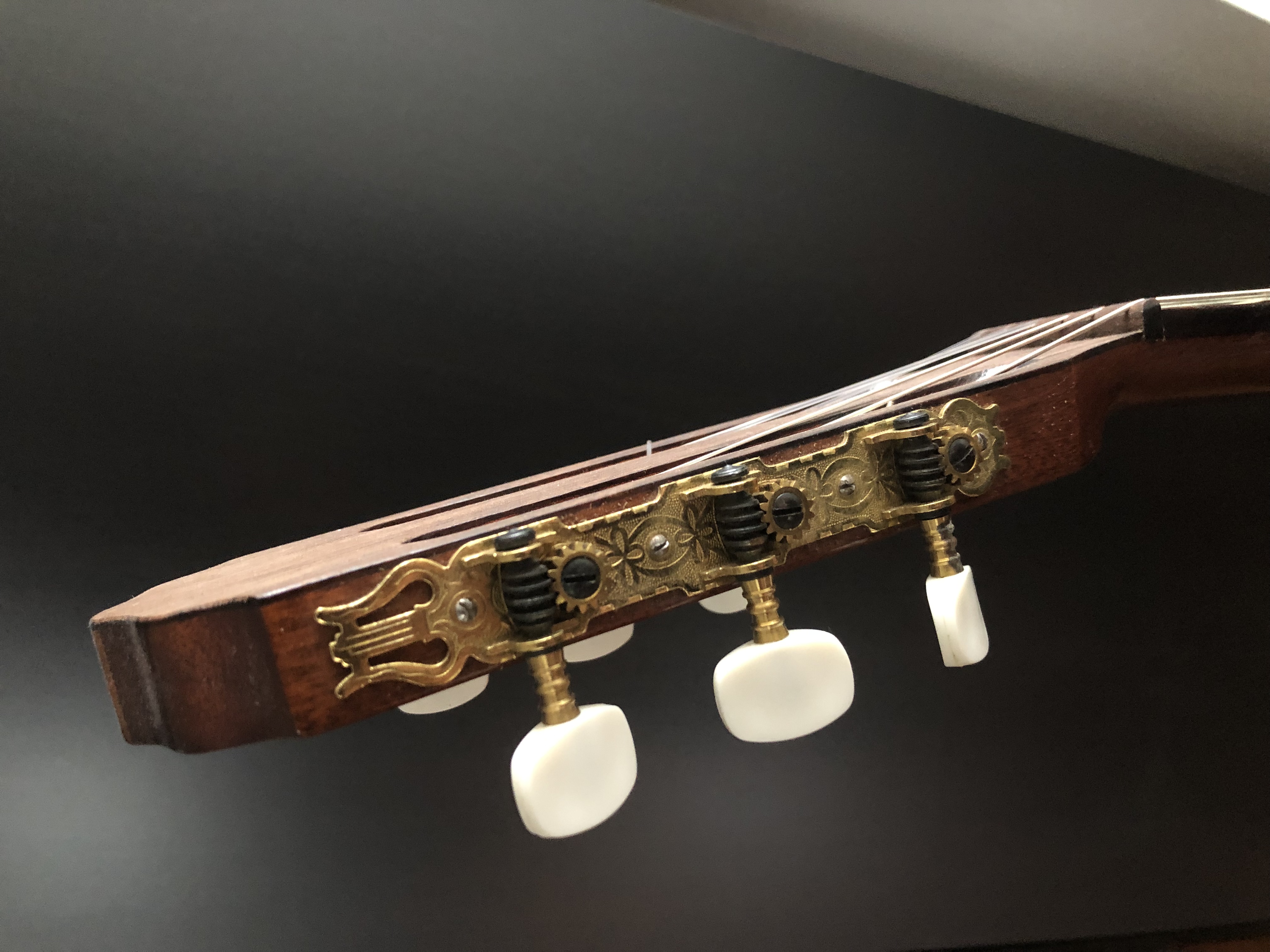 Leider sind mir nur wenige Informationen zu der Gitarre bekannt. Auf einem Zettel, der ihr beilag, stand, dass sie im Januar 1990 aus kaukasischem Nussbaumholz gebaut wurde und einen spanischen Halsfuß besitzt. Die Decke ist meines Erachtens aus Fichte gefertigt. Im Schallloch konnte ich keine Schrift finden.