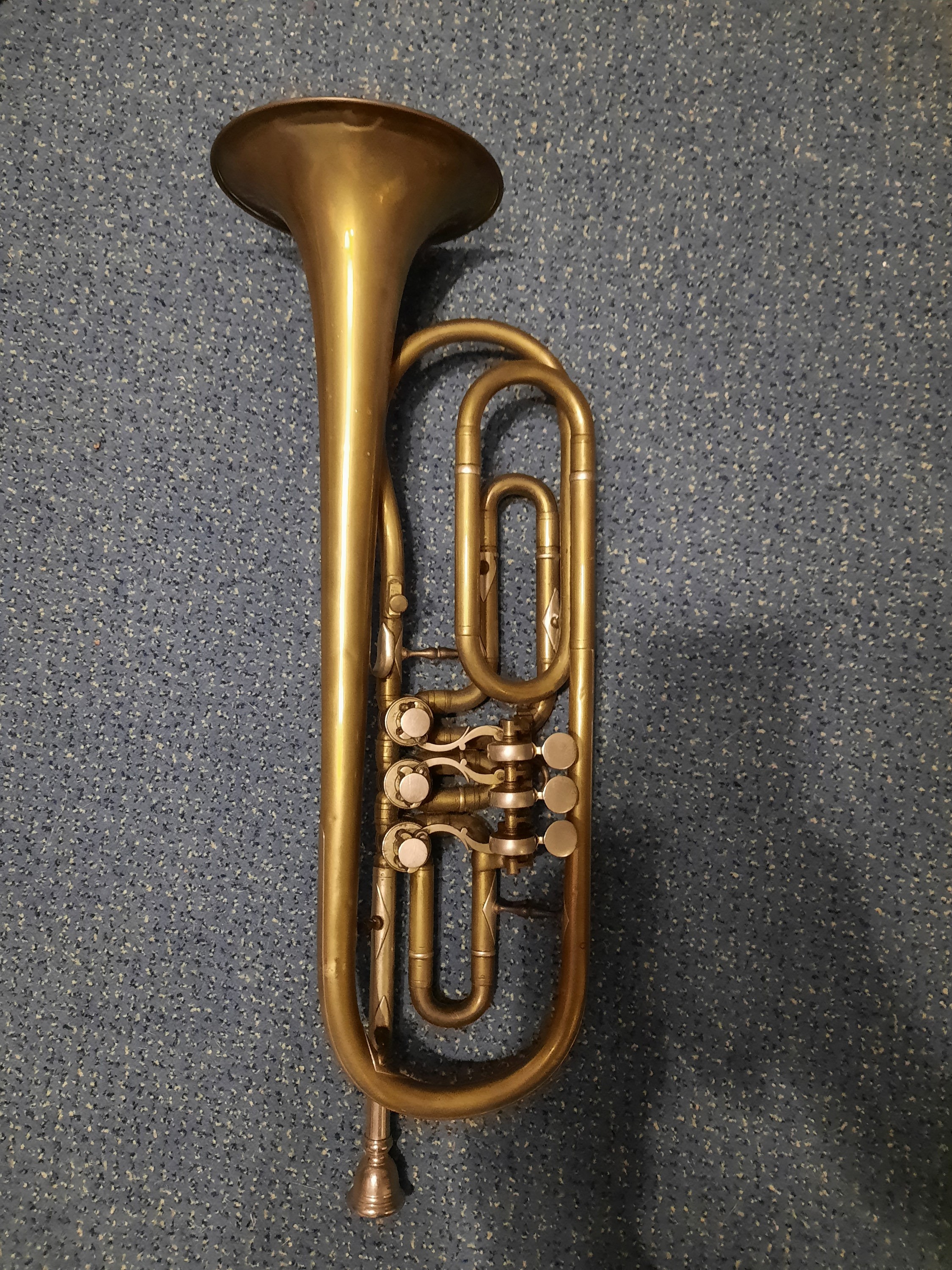 Ich bin kürzlich zu einer älteren Trompete gekommen und versuche nun auf diesem Wege einige Informationen über sie zu erhalten, da leider außer einer "99" auf den Ventilen keinerlei Beschriftung zu finden ist. Außerdem ist meiner Meinung nach die Form der Rohre etwas ungewöhnlich (siehe Bilder). Eine weitere Frage wäre ob es sich lohnen würde die Trompete restaurieren bzw. reparieren zu lassen, da sie an einigen Stellen kleinere Dellen hat und in einem Rohr ein kleiner Riss ist (siehe Bild mit Markierung). Vielen Dank schon mal im Voraus.
