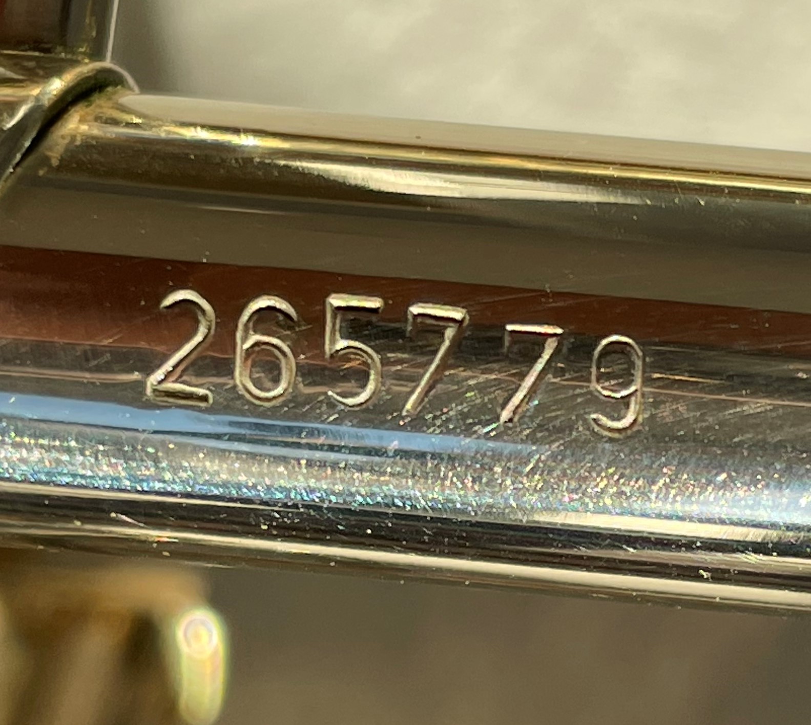 Auf dem Mundrohr ist die Zahl "265779" eingeschlagen, an dessen oberen Ende der Buchstabe "E" und auf allen 3 Ventilen ist auf der Seite zu den Bögen eine "4" zu sehen - aus welchem Jahr stammt denn das gute Stück und gibt es vielleicht noch mehr Details in Erfahrung zu bringen?