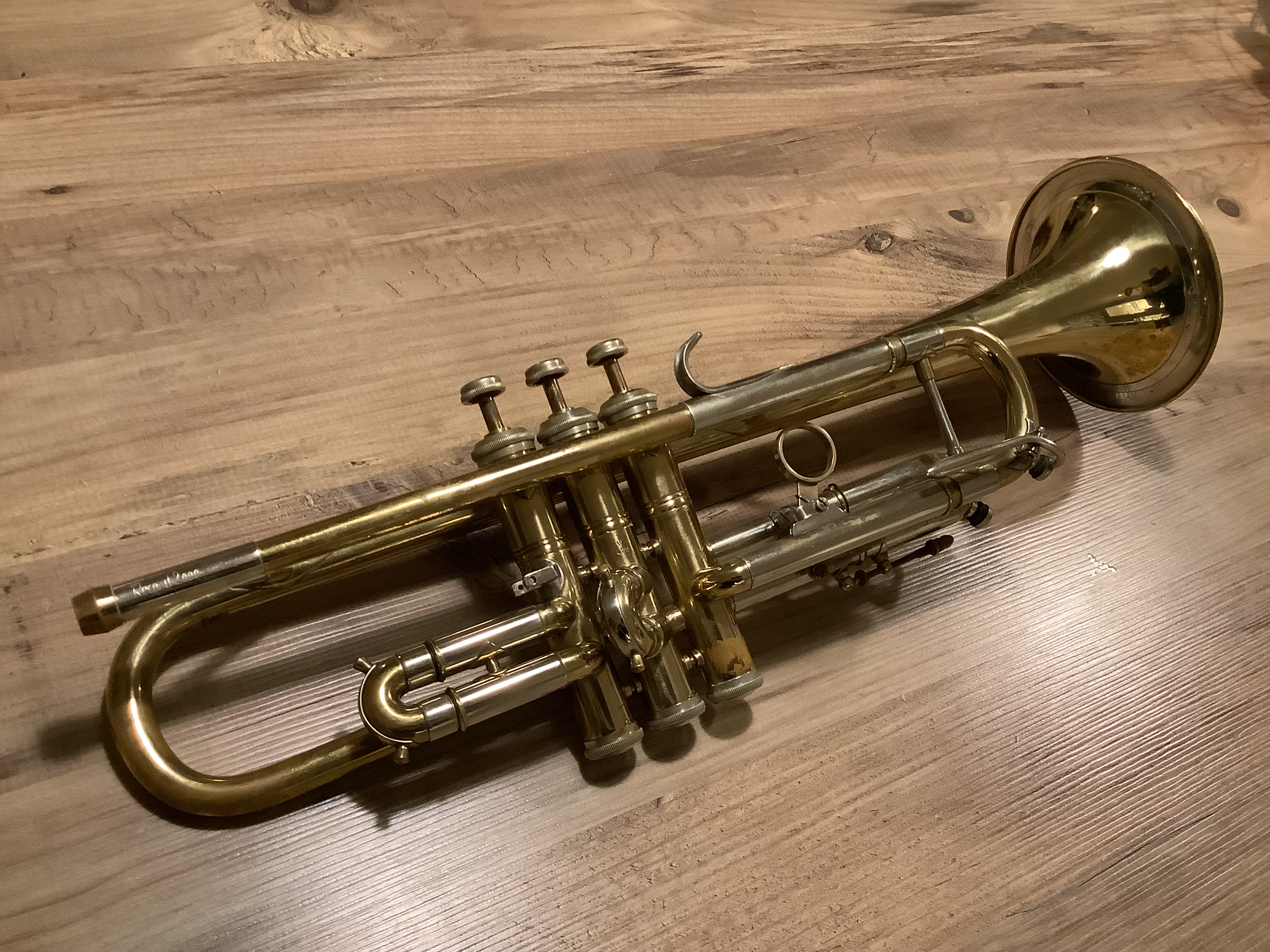 Nun würden wir gern wissen, wie alt die Trompete schon ist. Bestimmt können Sie uns helfen. Der Lack der Trompete hat zwar im Laufe der Jahrzehnte etwas gelitten, ansonsten ist sie aber bis auf den fehlenden Trigger am 1. Ventil noch in tadellosem Zustand.
