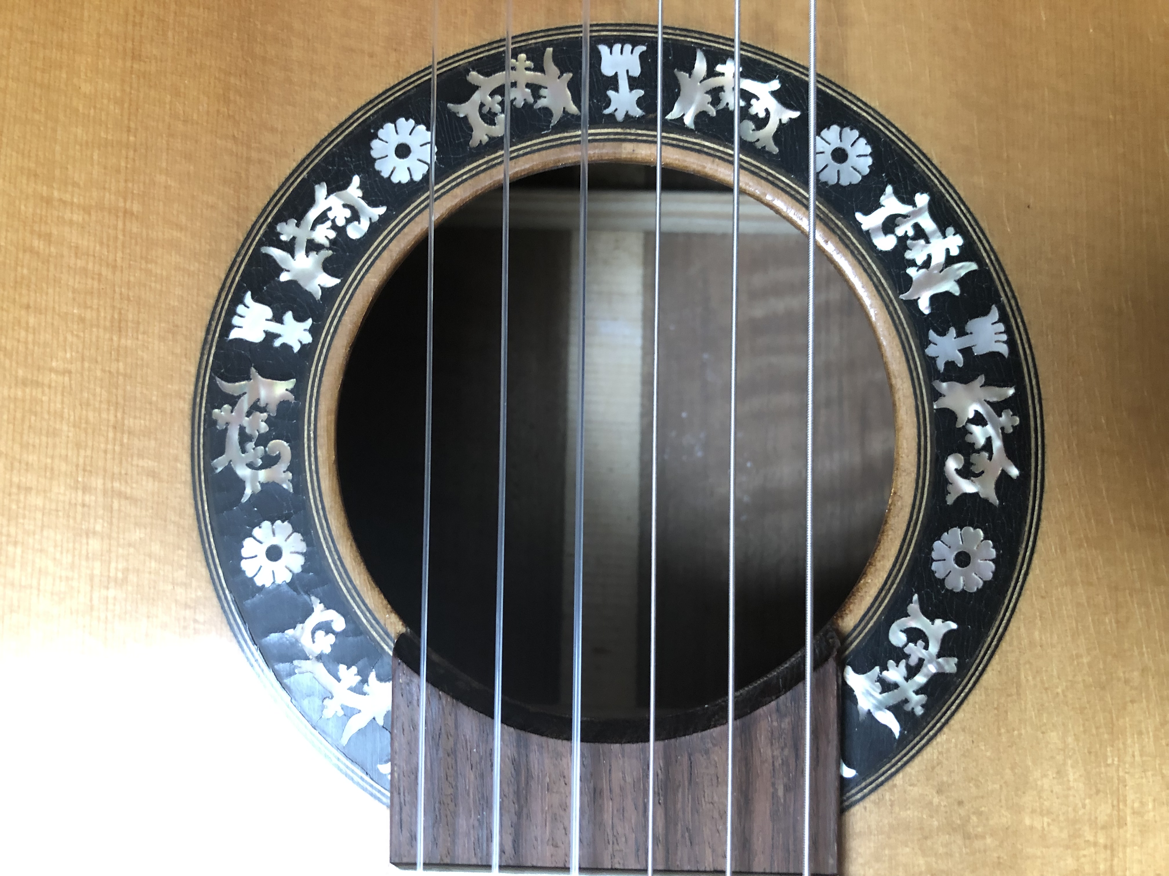 Leider sind mir nur wenige Informationen zu der Gitarre bekannt. Auf einem Zettel, der ihr beilag, stand, dass sie im Januar 1990 aus kaukasischem Nussbaumholz gebaut wurde und einen spanischen Halsfuß besitzt. Die Decke ist meines Erachtens aus Fichte gefertigt. Im Schallloch konnte ich keine Schrift finden.