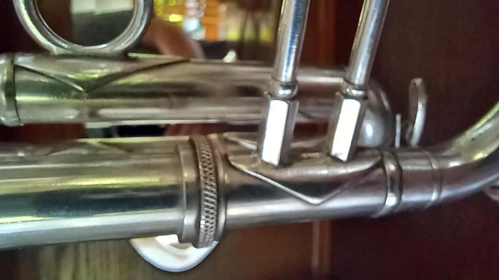 Glückwunsch zu der tollen Trompete! Bisher konnte ich 4 fast baugleiche Jazztrompeten von Walter Fischer sehen, was auf ein konstantes Festhalten eines bewährten Modells schließen lässt (Ausnahme 3. Ventilzug, da baute er auch mal "normal", nicht "gestürzt"). Scheinbar immer gleich war der aus Halbrundblech gefertigte Fingerhaken und dessen Form, gleiches lässt sich schon bei Bernhard Kohl finden. Die Form (den Zulieferer?) der Stützenplättchen scheint Walter Fischer ebenfalls von seinem Schwiegervater übernommen zu haben. Der Stimmzug bei Kohl jedoch enger, auch die beiden Stützen stehen dort zwangsläufig enger zusammen.