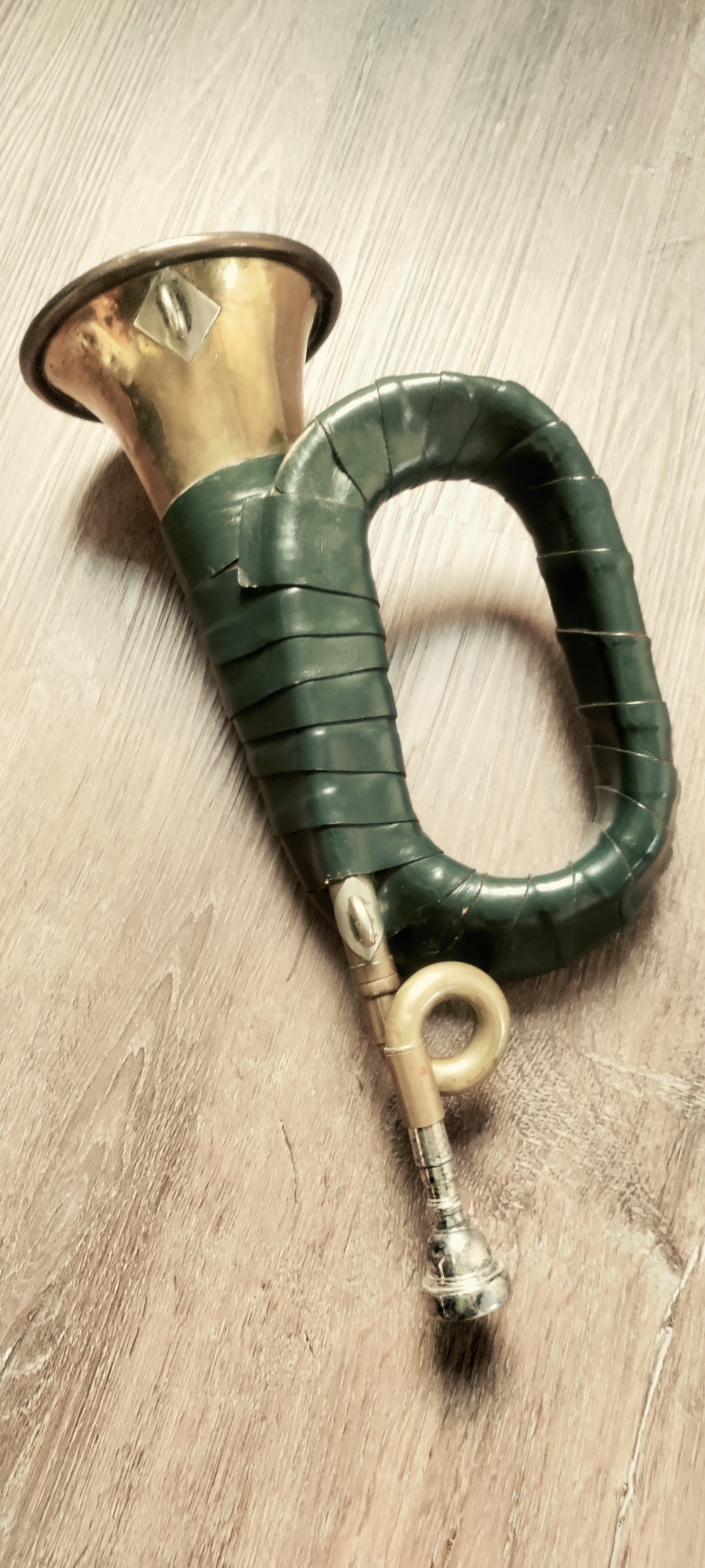 es dürfte sich um ein Signalhorn in C mit einem Verlängerungsstift für B handeln. Und ja, in Kriegszeiten waren diese Instrumente auch unter dem Begriff "Infanterie-Horn" bekannt.