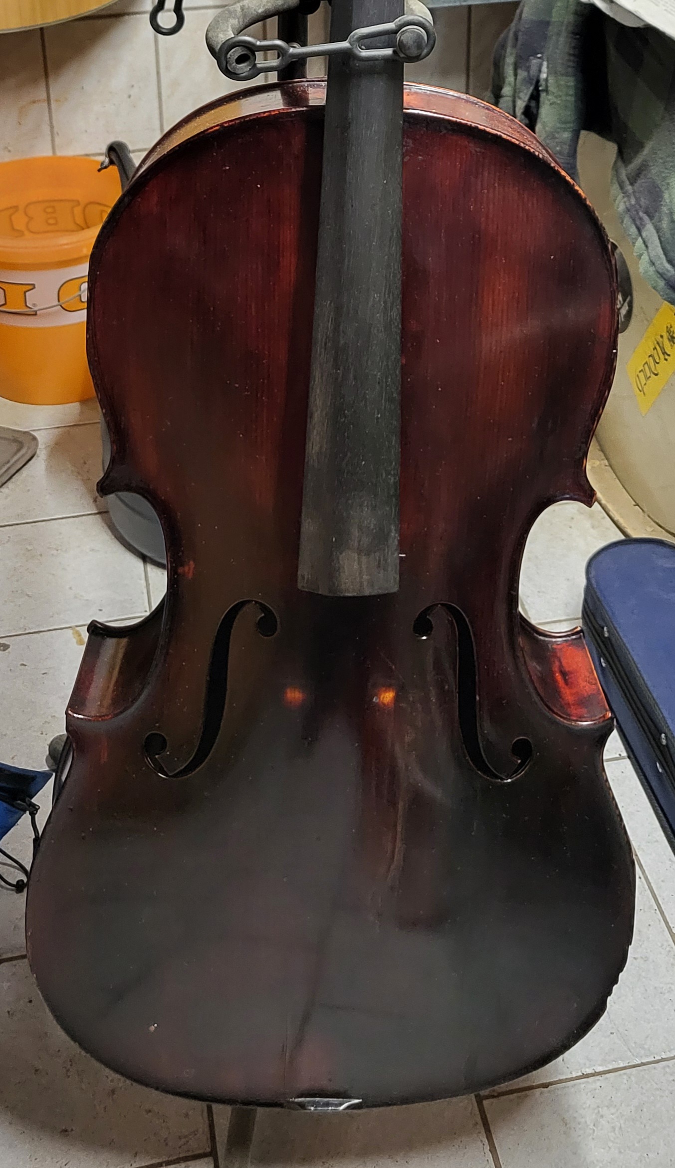 Ich habe ein Cello mit einem Zettel im Inneren.