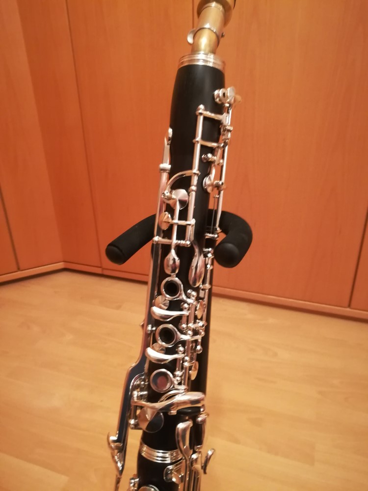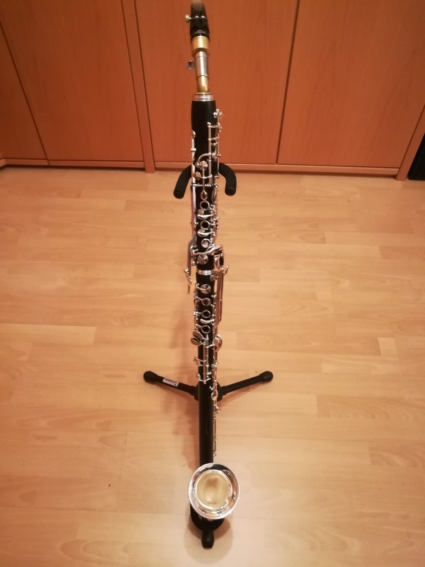 Ich spiele das Instrument mit einem Mundstück von Herbert Wurlitzer M4* mit Pilgerstorfer Bassetto Blatt Stärke 3 bzw. einem Zinner 4M mit einem AW-Reed Bassetthornblatt Deutsch Nr. 601 Stärke 3.