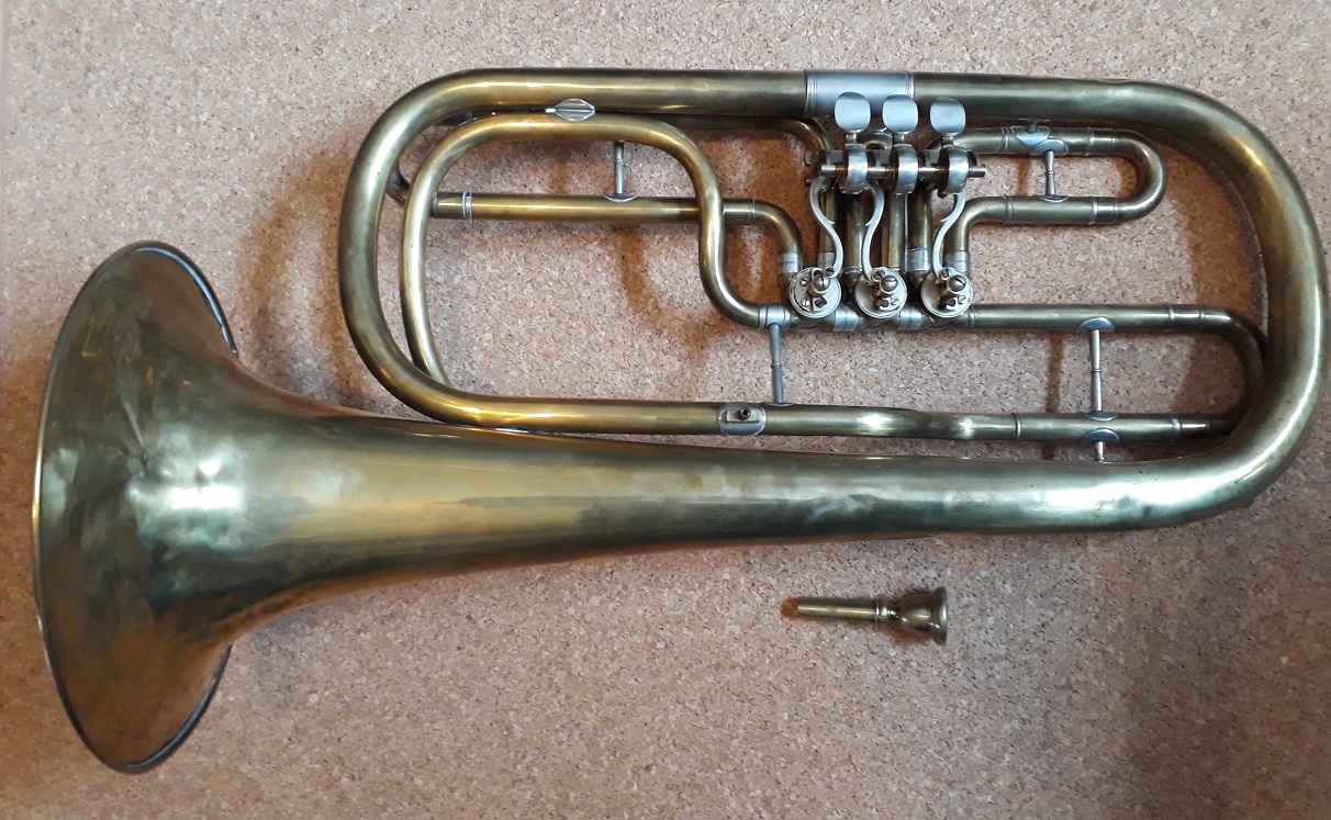 Zuletzt spielte er das Flügel- bzw. Tenorhorn. Soweit ich mich erinnere, hat er es als 'gerades Tenorhorn' bezeichnet. Es sieht aus wie ein Flügelhorn mit 3 Drehventilen - nur größer und breiter und es hat eine volle zusätzliche Rohrwindung, die ein normales Flügelhorn nicht hat. Im Gegensatz zu einem Tenorhorn hat es einen geraden Ansatz in Längsrichtung (also nicht um den Trichter herumgeführt). Es wird also gehalten, wie ein Flügelhorn.