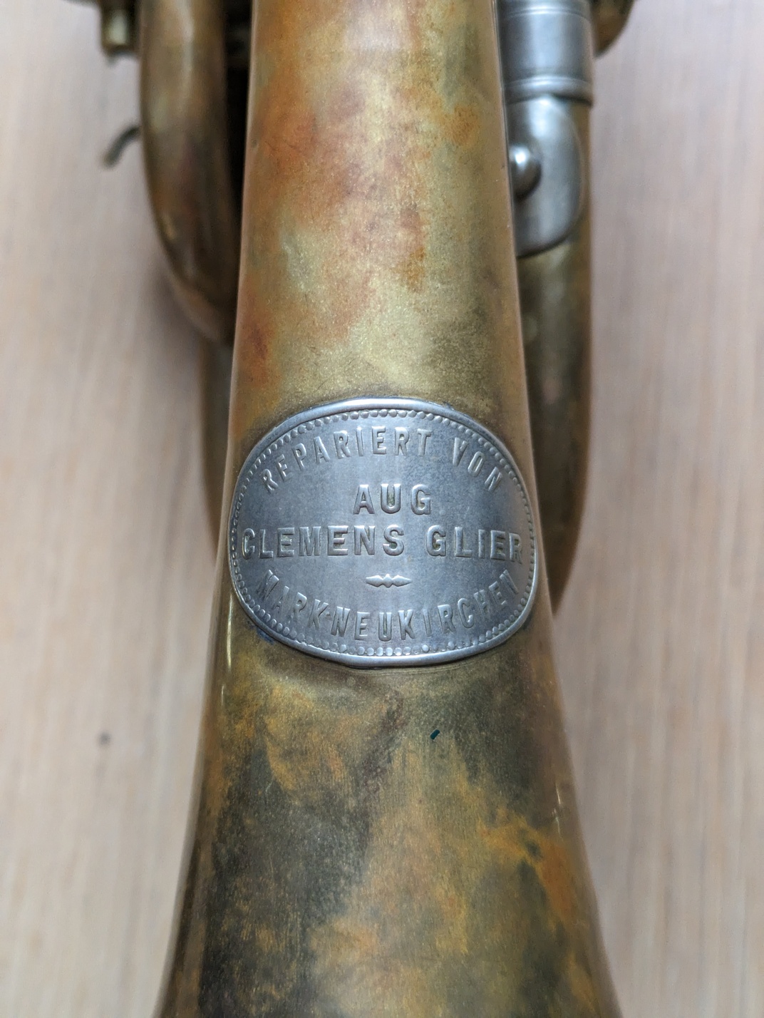 Es gibt meiner Meinung nach eine Erwähnung „repariert von aug Clemens Glier“ makneukirchen (Foto 4) später als die Trompete.