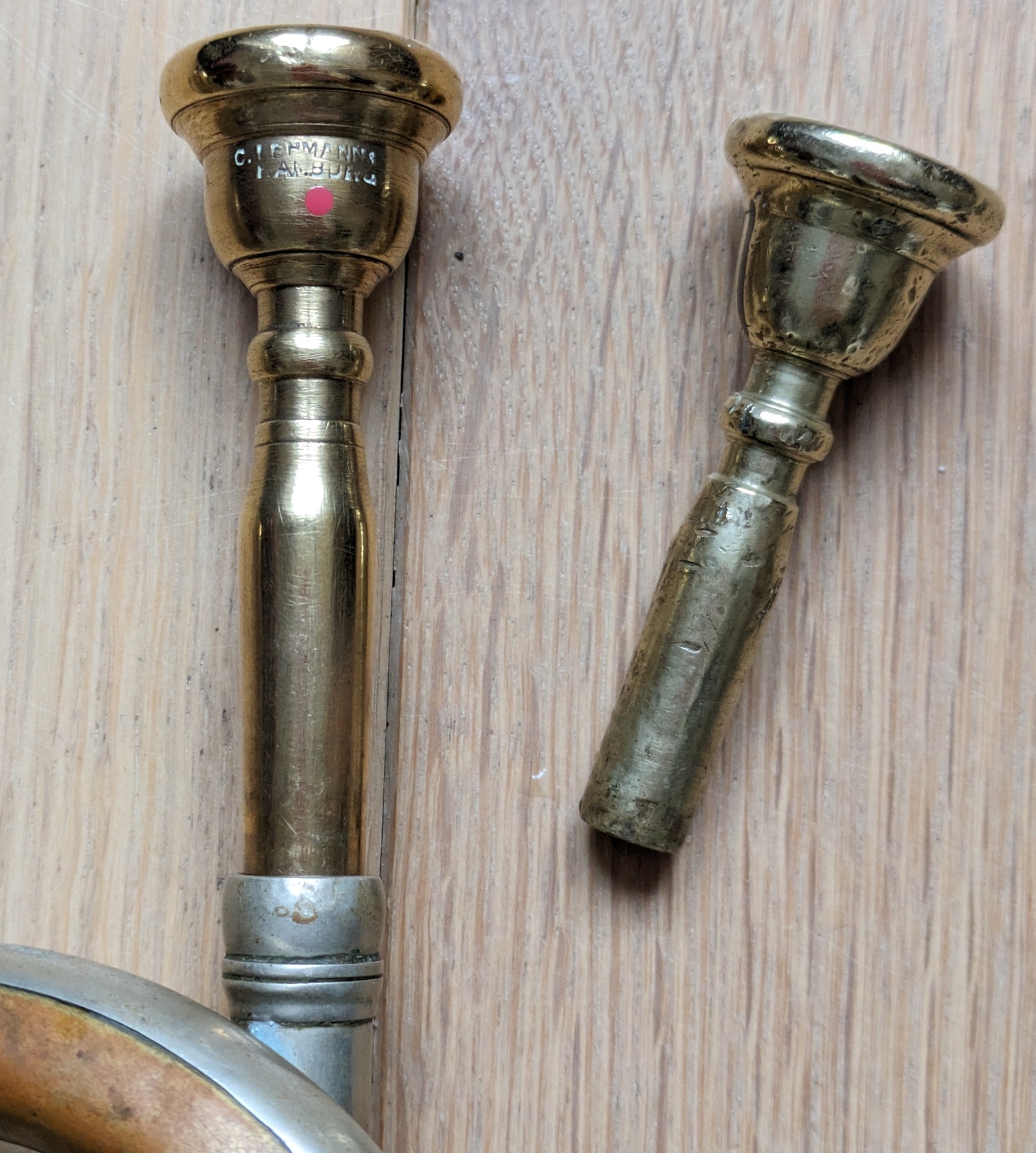 Wie wir auf Foto 3 sehen, habe ich es mit einem anderen „normalen“ Mundstück (dem linken) versucht, das weniger in die Trompete passt als das, das zu dieser Trompete passt. (rechts auf diesem Foto)