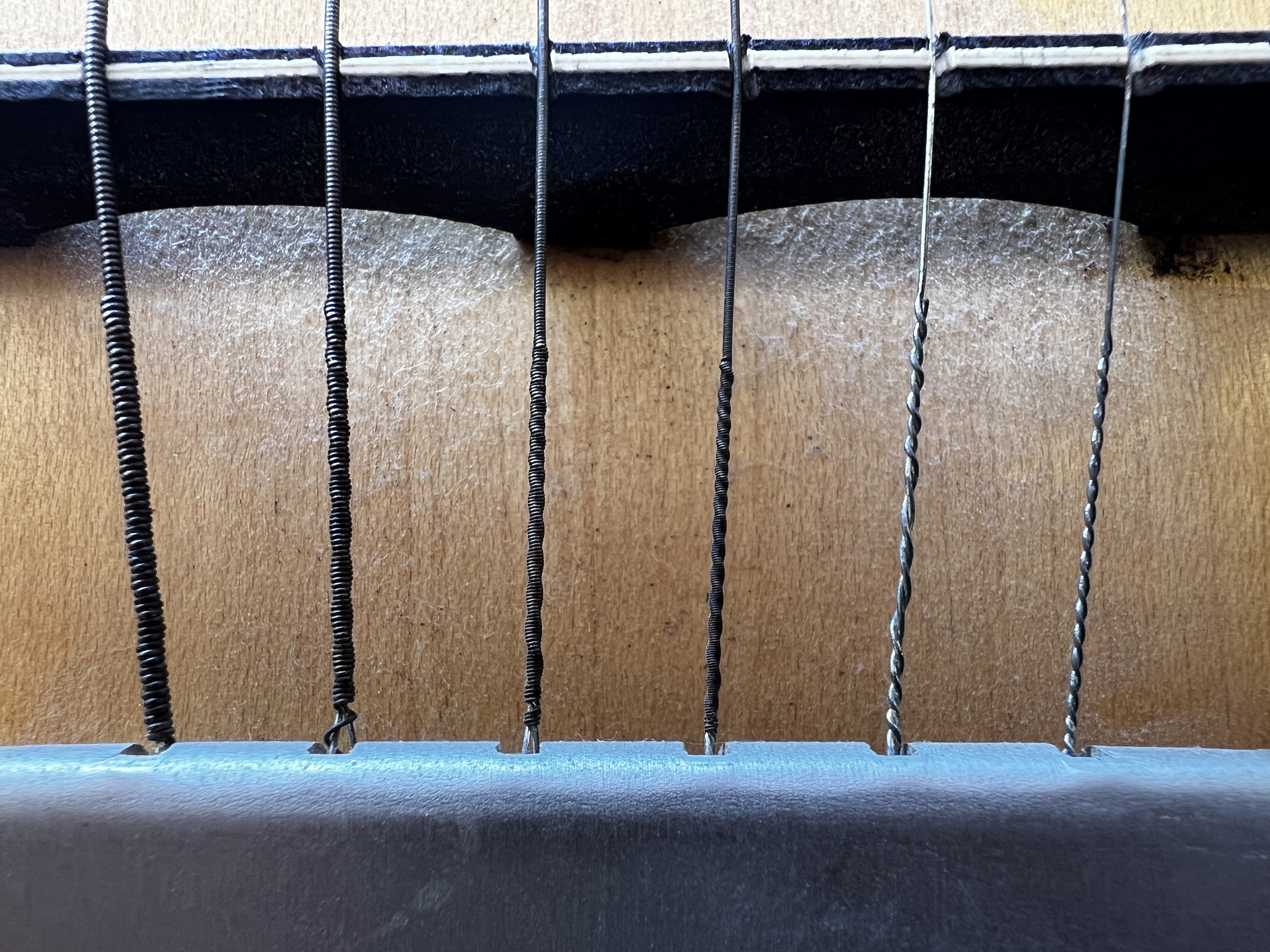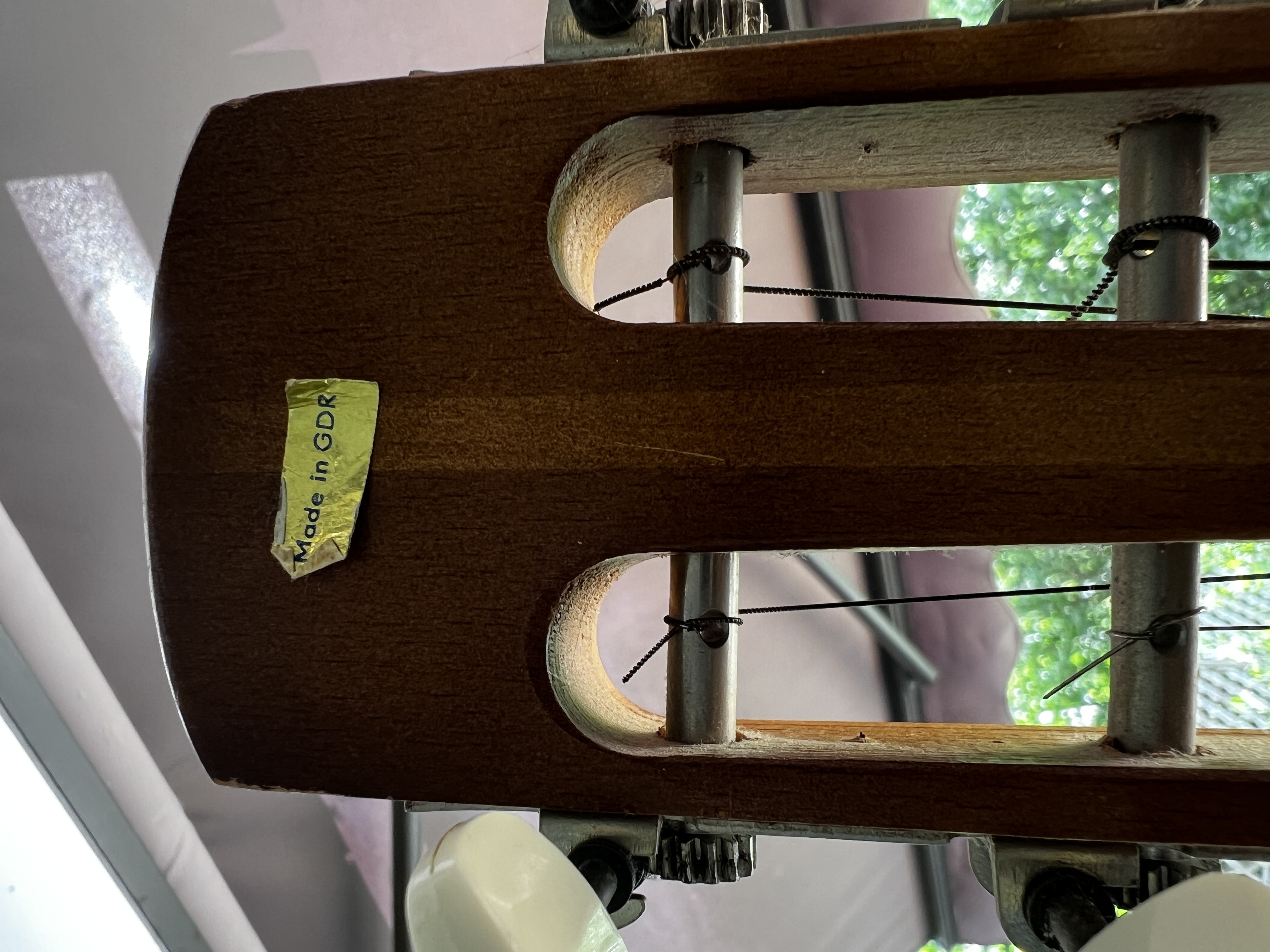 Ich habe das gute Stück auf einem Flohmarkt erworben. Für mich sieht es so aus, als ob das tatsächlich noch die Original Saiten sind. Zumindest aber keine aus heutiger Produktion-schaut euch mal die Wicklung an.