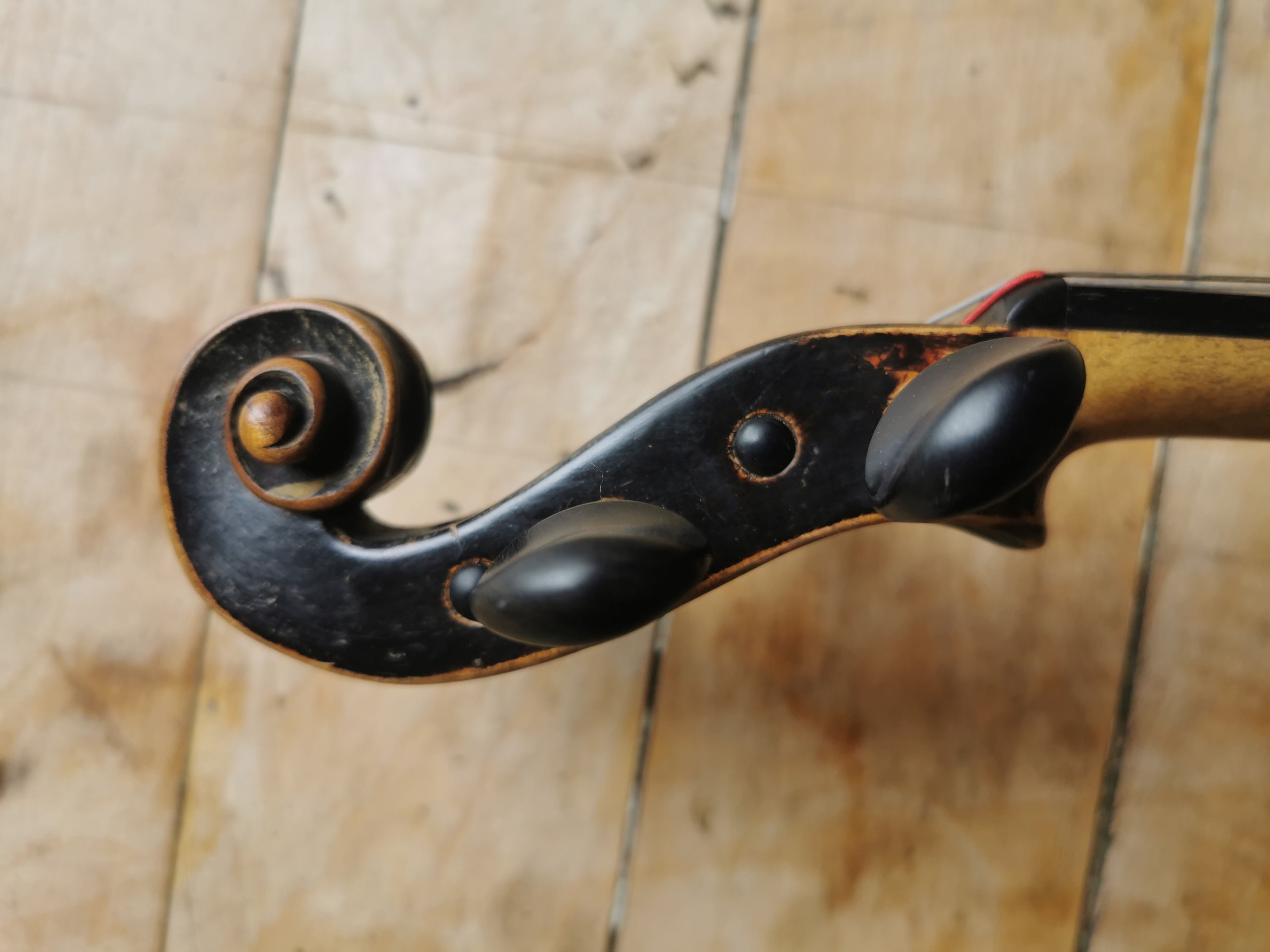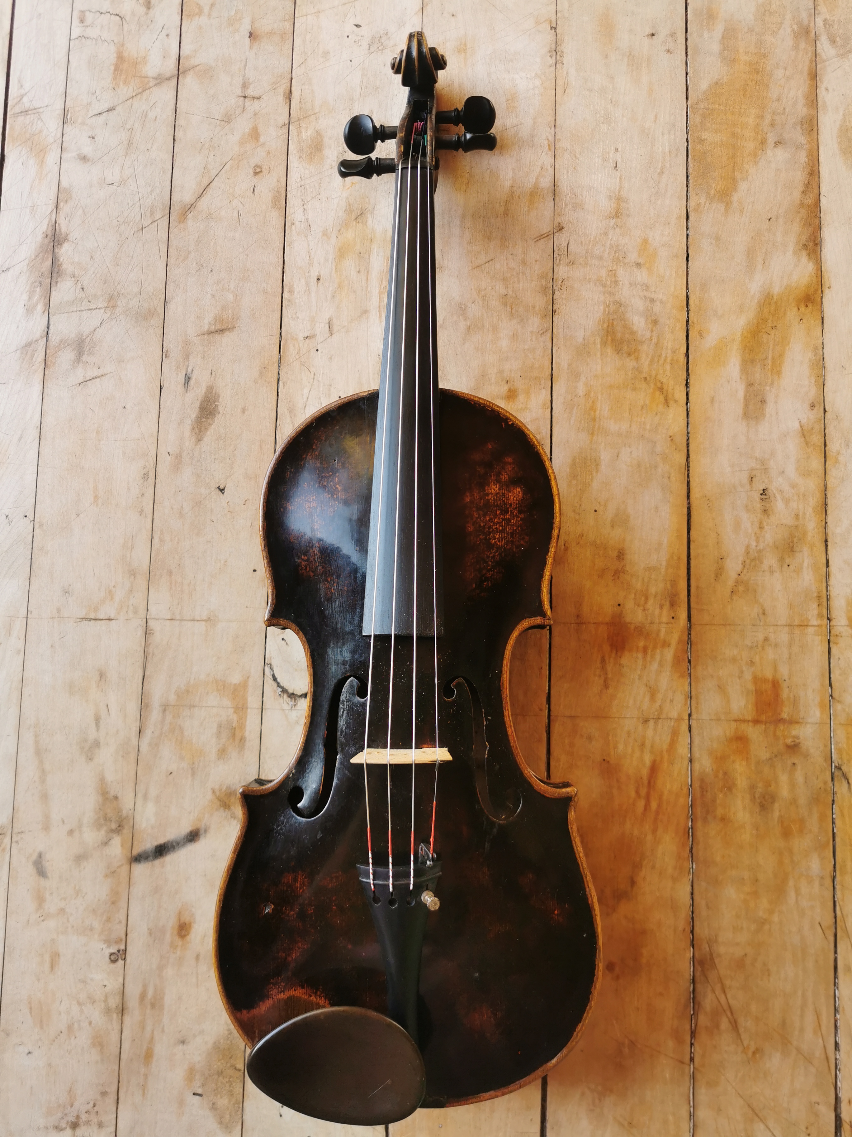 Sie ist aus der Musikinstrumente Erzeugung Johann Brandner aus Schönbach in Böhmen, die Nro. 514 nach Josef Klotz, ich schätze, ca. Jahrhundertwende. Zuletzt wurde sie als Geige bespielt, und das dem Griffbrett nach zu beurteilen bis in die dritte Lage recht viel.