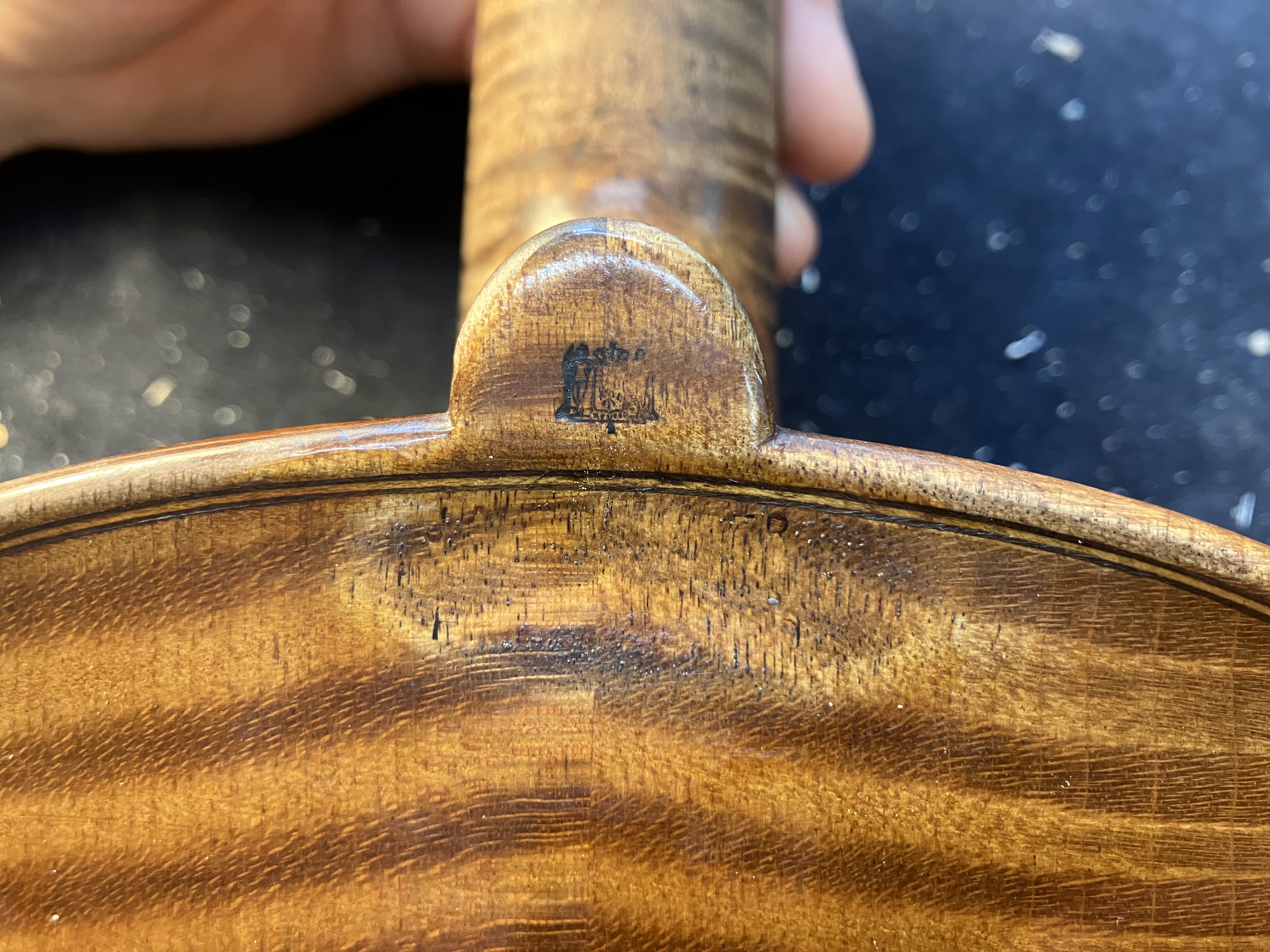 ich habe eine ältere kleine Bratsche vogländischer Bauart vorliegen, die einen Brandstempel am Zäpfchen aufweist - siehe Foto. Weiß eine/r der Moderatoren von welchem Hersteller dieser Brandstempel verwendet wurde?