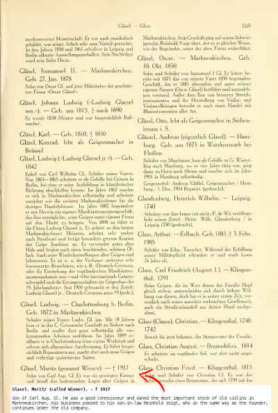 Son of Carl Aug. Gl. He was a good connoisseur and owned the most important stock of old violins in Markneukirchen. His business passed to his son-in-law Reinhold Voigt, who in the same way as the founder, continues under the old company.