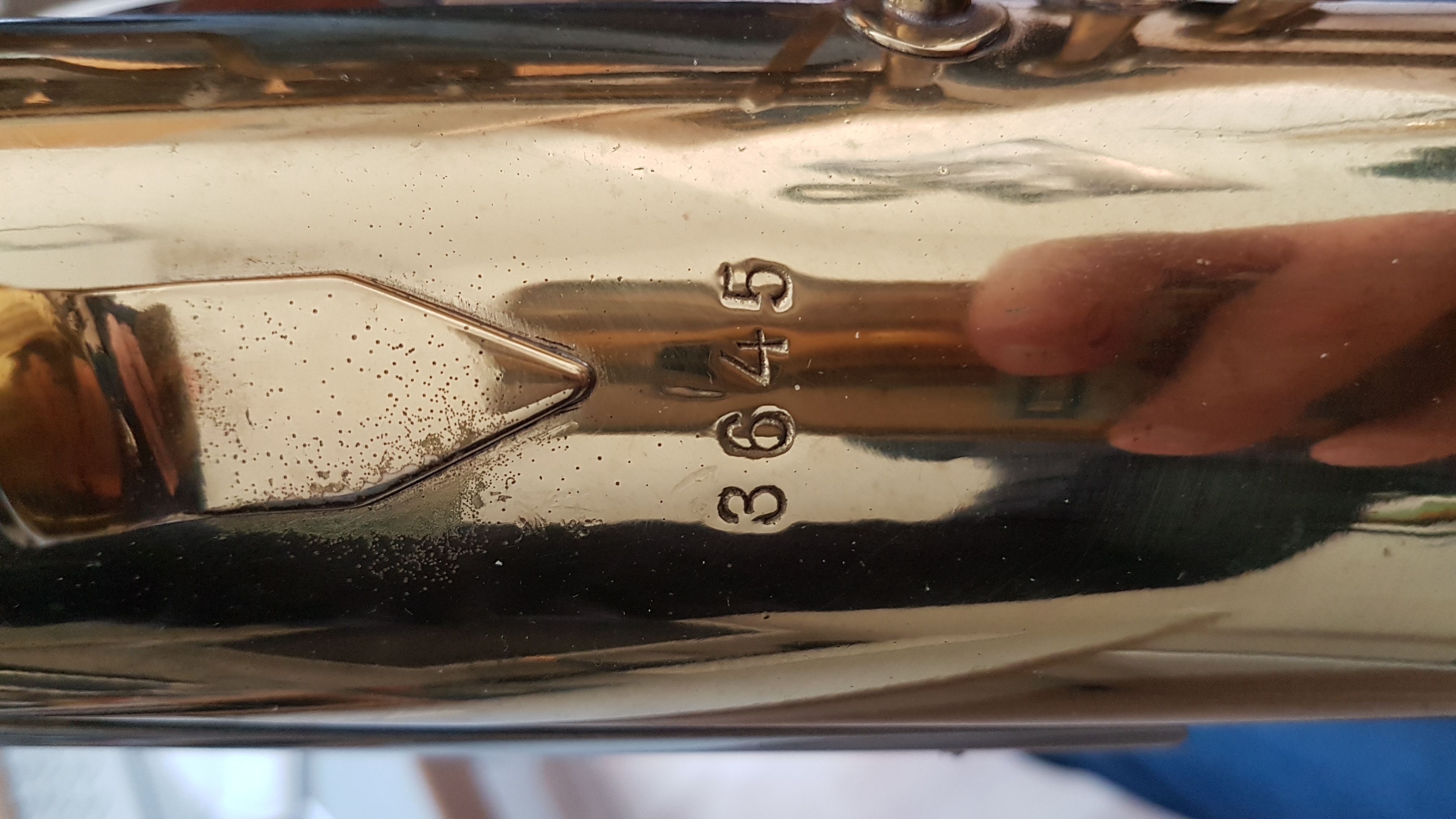 dieser Boosey & Hawkes Schriftzug steht eingraviert direkt über der unteren Verbindungsstelle am Schalltrichter, direkt unterhalb der 3 großen Klappen. Auf dem Bild mit dem Saxophonkoffer kann man die Schrift leicht erkennen (allerdings nicht lesen) wenn man etwas reinzoomt. Die Seriennummern sind eingeschlagen.
