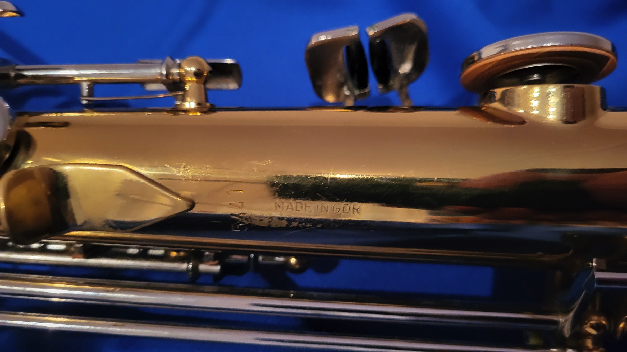Die Seriennummer 5441 wurde im JUNI 1990 gebaut, also nach der Wende. Trotzdem hatte das Sax noch den Stempel "Made in GDR".