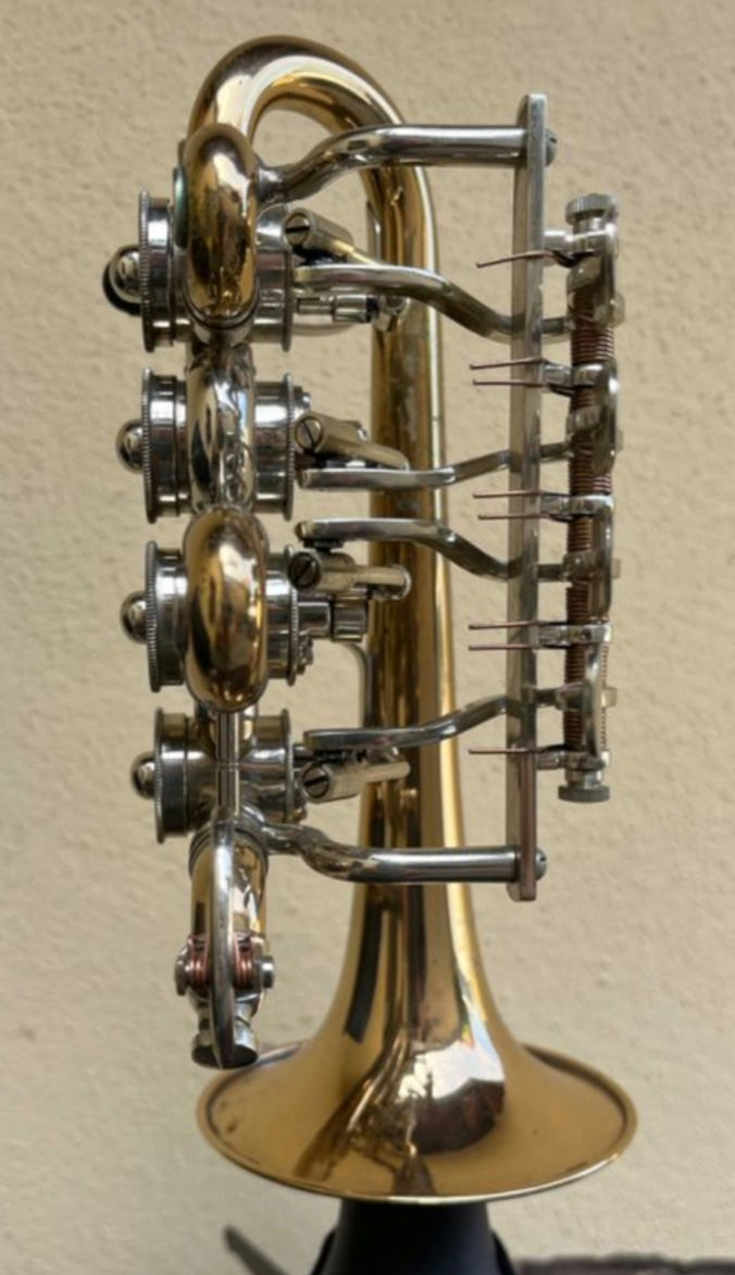 und die zeitgleich von mir erworbene Es-Trompete mit einer Gravur "K", besprochen hier vor kurzem in einem anderen Beitrag im Forum, könnten von dem gleichen Künstler/Trompeter/Besitzer erworben worden sein oder gehört haben.