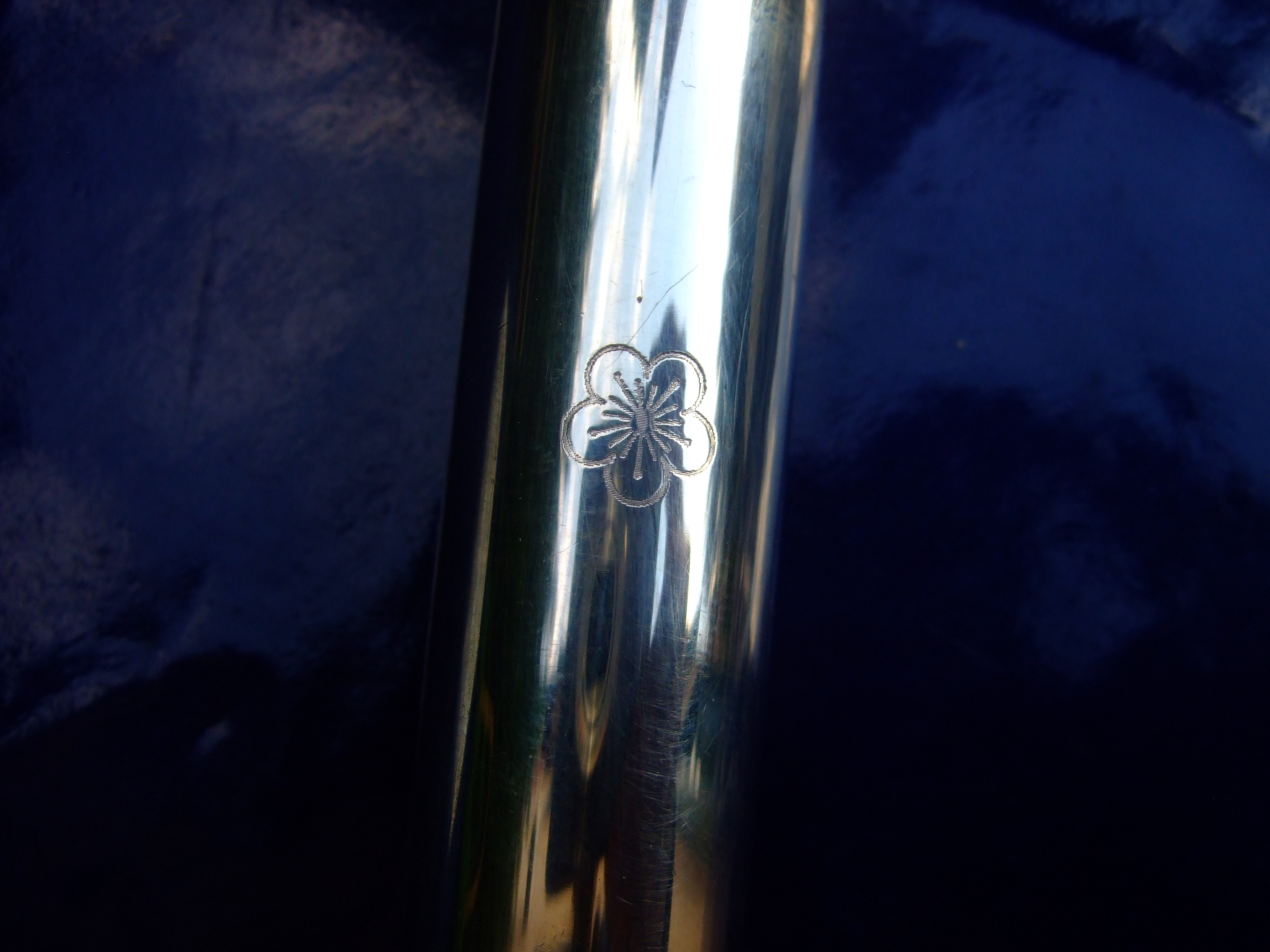 Ich habe kürzlich eine Altus-Querflöte aus der Zeit um 1990 erworben. Sie kam mit einem anderen Kopfstück. Anstelle eines Namenszeichens gibt es eine fünfblättrige Blume. Ich tippe auf Mateki, da hat man so etwas gemacht. Ich habe den deutschen Repräsentanten von Mateki angeschrieben. Es schickte mir Bilder aus einem alten Mateki-Katalog. Da gb es tatsächlich vier Blätter/Blüten, aber meine war nicht dabei. ?? Es gibt enen missglückten Silberstempel: eine 900 , die mit einer 8 überstempelt wurde. Kann jemand helfen?