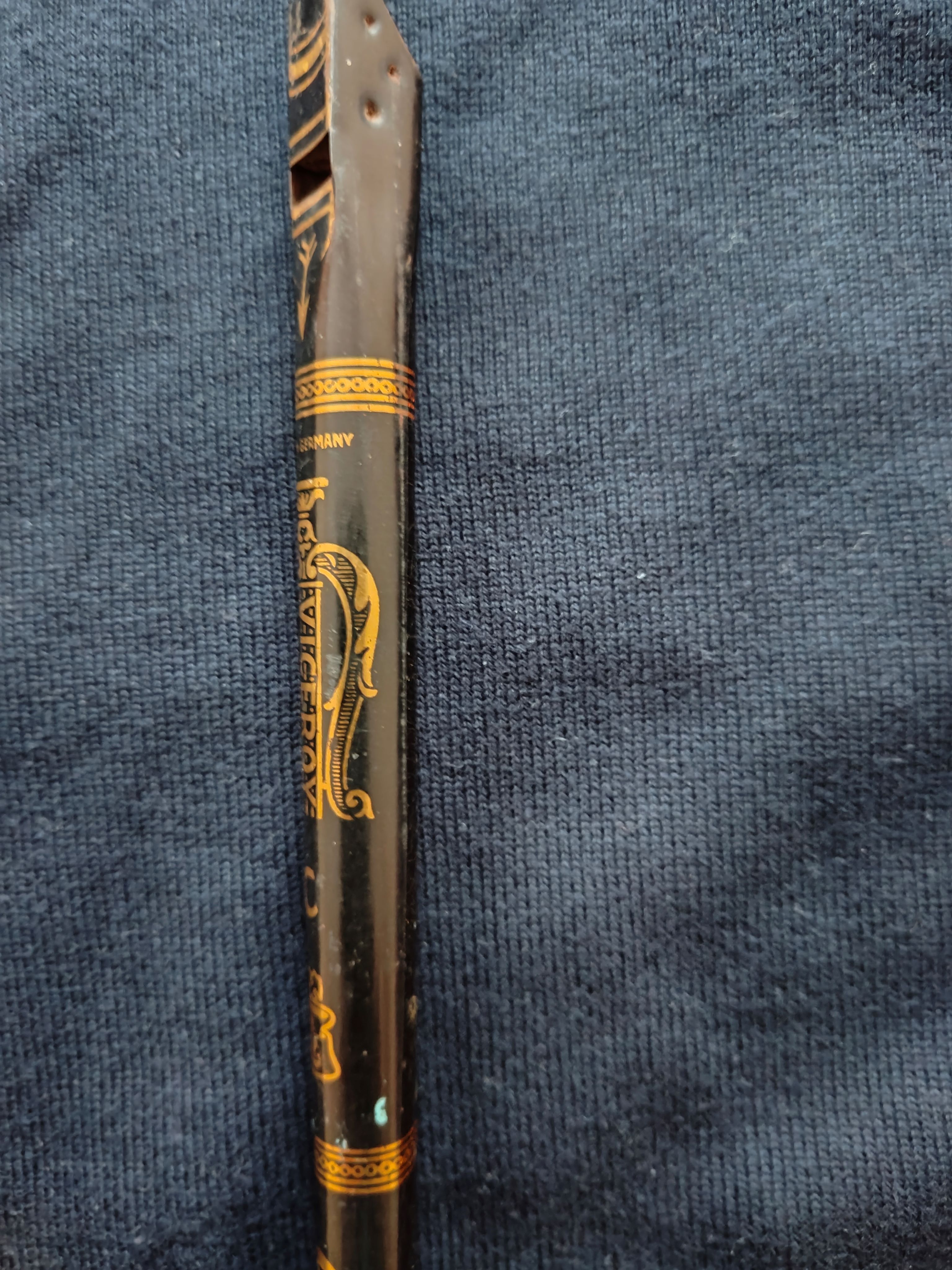 ich habe bei mir 2 Flöten von meinem Großvater gefunden. Das vermutliche Alter dürfte etwa 90 - 100 Jahre sein. Mich würden die Hersteller und das Alter interessieren. Vielleicht kann mir jemand helfen. Die 1. Flöte ist ein Metall/Blechflöte "Viceroy", Made in Germany. Die 2. ist eine Okarina Flöte mit einem unerkenntlichen Zeichen am Mundstück.
