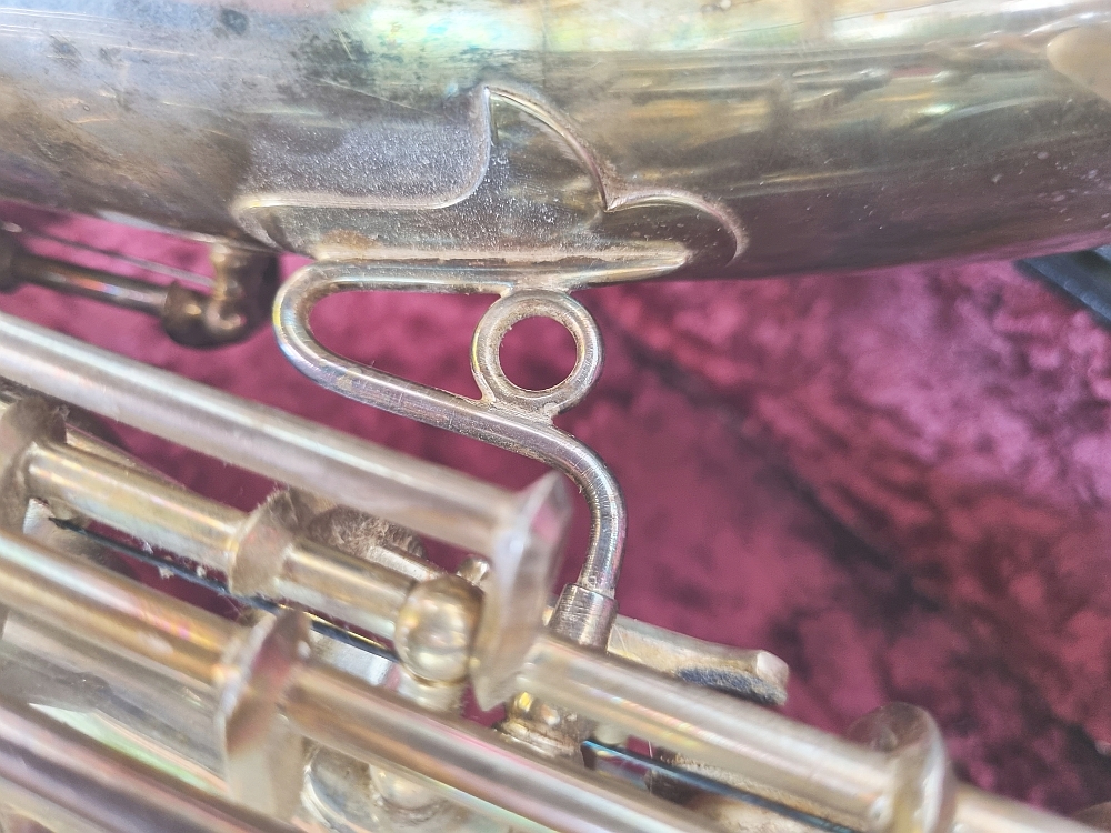 In den Sinn kommt mir die Firma Hammerschmidt, die nach dem Krieg in Burgau ansässig war. Die Saxofone von dort sehen nach meiner Erfahrung alle etwas anders aus. Diese „Bastel“-Becherverbindung würde reinpassen. Die Drückerplatte für G#C#HBb sieht bei einem späteren Hammerschmidt-Tenor sehr ähnlich aus (siehe Foto).