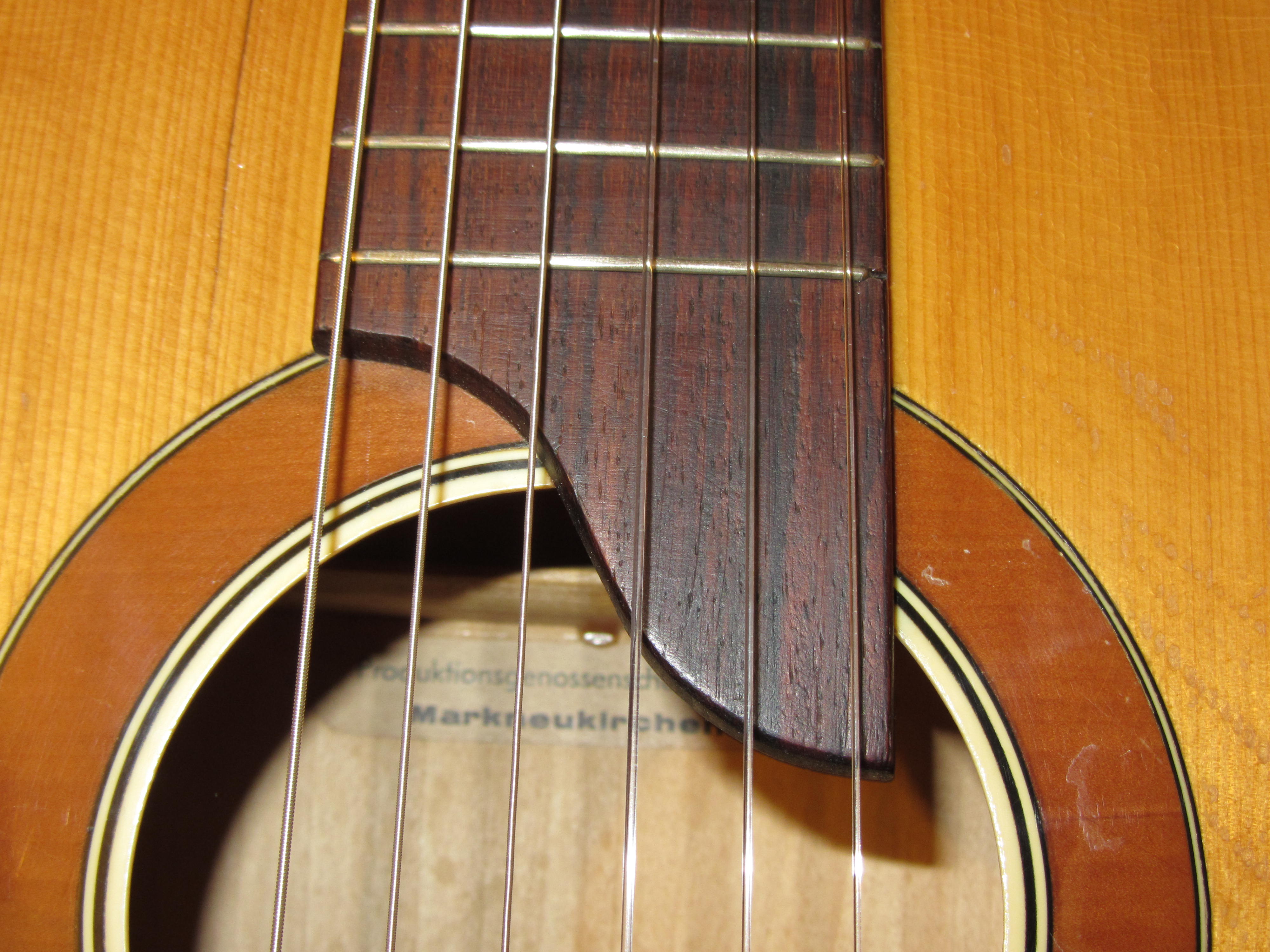 Ich habe eine identische Gitarre, lediglich die Rosette um das Schallloch ist anders, etwas einfacher wie an Deinem Modell. Ich habe die Gitarre komplett restauriert und die Stegeinlage gegen eine kompensierte Knochenstegeinlage getauscht. Meine hatte zwei fiese Risse auf der Decke, lies sich aber reparieren. Klingt sehr gut, ich spiele sie total gerne.