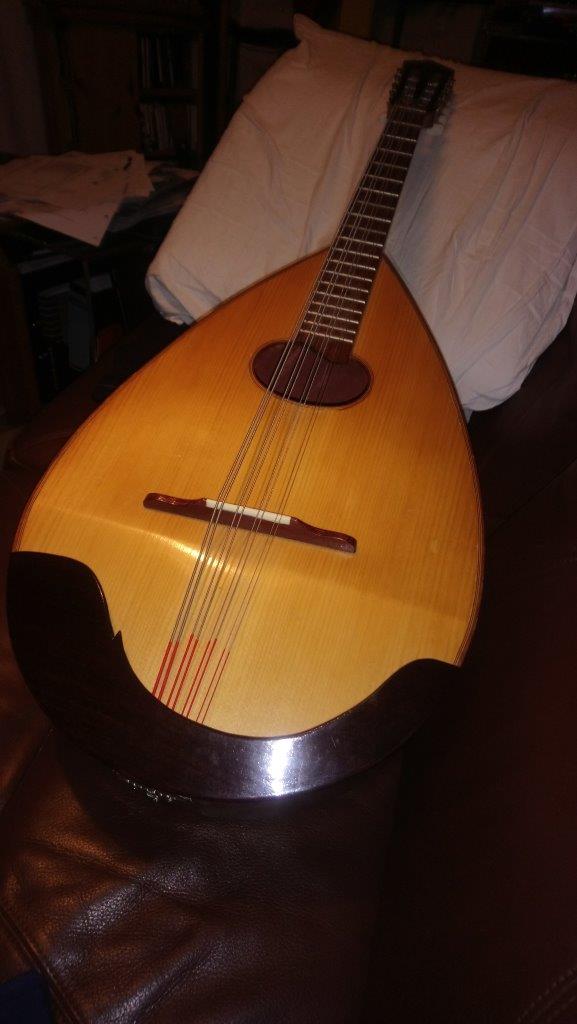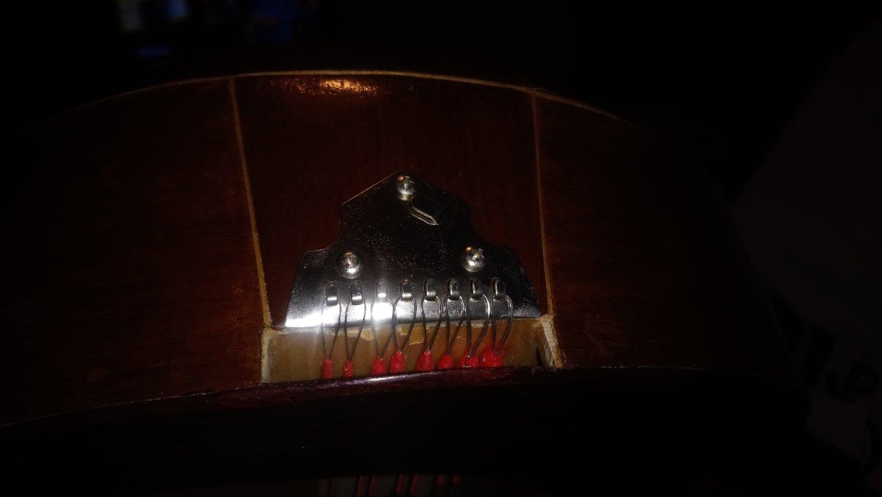 Guten Tag, mir ist ein Mandoloncello zugeflogen, dessen Herkunft der ("westdeutsche") Vorbesitzer nicht wusste und das ich auch nicht verorten konnte. Vielleicht ist es ein vogtländisches Instrument. Es ist grundsätzlich gut und sauber gebaut; auffallend sind der sichtbar gedübelte (oder zumindest das mit einem Dübel verschlossene Schraubenloch vom) Hals und der wellige Korpus, der eigentlich eher den Eindruck macht, als ob er überfurniert wäre. Auch der Saitenhalter weist ein kleines Detail auf (einen "Haken" an der unteren Schraube), das mir sonst noch nie aufgefallen ist.