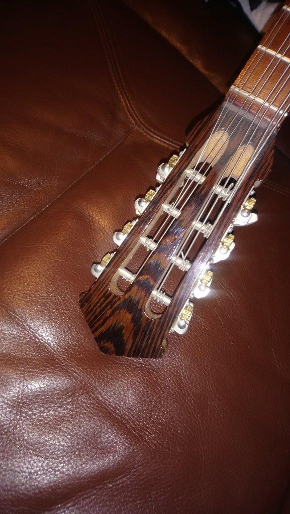 Der Steg ist offenbar angeklebt; er steht sichbar etwas schräg, allerdings ist die Infonation besser, als befürchtet. Daher habe ich ihn noch nicht abgelöst. (Auch den leichten Offset zur Halsmitte kann ich aktuell verschmerzen.) Die Decke hat sich zwischen Schallloch und Knick auch etwas gesenkt, ca. max. 3mm gegenüber einem Lineal, das am Knick aufliegt; dies scheint aber stabil zu sein (das Instrument habe ich mittlerweile über ein Jahr).