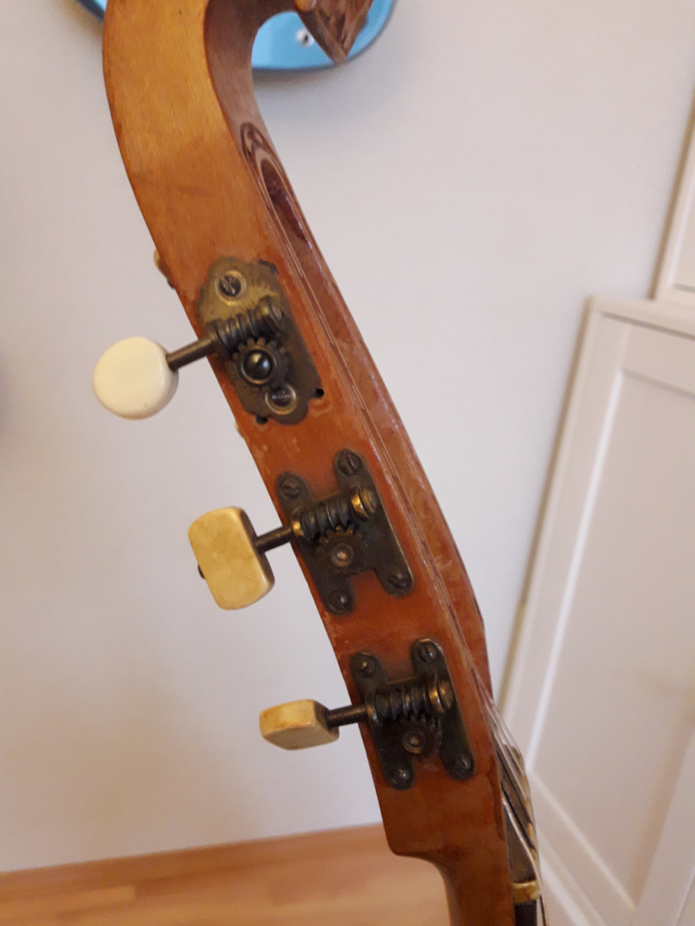 Die Laute wurde in jedem Fall viel benutzt. Die Decke weist starke Gebrauchsspuren auf. Die Bridge-Pins wurden scheinbar teilweise ausgetauscht. Eine Stimmmechanik ebenfalls. Der Hals oder zumindest der Kopf scheint leicht verzogen zu sein, ob das einen Auswirkung auf die Bespielbarkeit hat, werde ich sehen, wenn ich neue Saiten drauf gezogen habe.